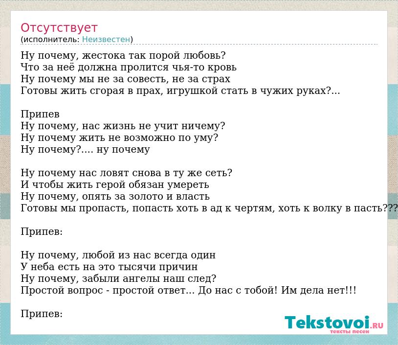 Ну почему, жестока так порой любовь? Что за неё должна пролится чья-то кровь Ну почему мы не за совесть, не за страх Готовы жить сгорая в прах, игрушкой стать в чужих руках?... Припев Ну почему, нас жизнь не учит ничему? Ну почему жить не возможно по уму? Ну почему?.... ну почему Ну почему нас ловят снова в ту же сеть? И чтобы жить герой обязан умереть Ну почему, опять за золото и власть Готовы мы пропасть, попасть хоть в ад к чертям, хоть к волку в пасть??? Припев: Ну почему, любой из нас всегда один У неба есть на это тысячи причин Ну почему, забыли ангелы наш след? Простой вопрос - простой ответ... До нас с тобой! Им дела нет!!! Припев: