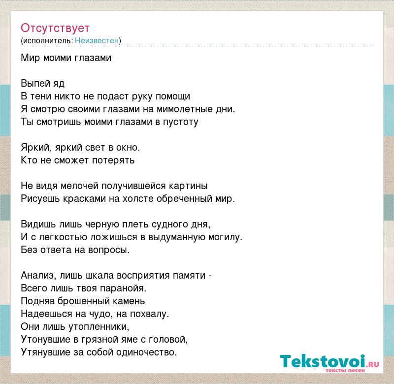 Мир моими глазами Выпей яд В тени никто не подаст руку помощи Я смотрю своими глазами на мимолетные дни. Ты смотришь моими глазами в пустоту Яркий, яркий свет в окно. Кто не сможет потерять Не видя мелочей получившейся картины Рисуешь красками на холсте обреченный мир. Видишь лишь черную плеть судного дня, И с легкостью ложишься в выдуманную могилу. Без ответа на вопросы. Анализ, лишь шкала восприятия памяти - Всего лишь твоя паранойя. Подняв брошенный камень Надеешься на чудо, на похвалу. Они лишь утопленники, Утонувшие в грязной яме с головой, Утянувшие за собой одиночество.