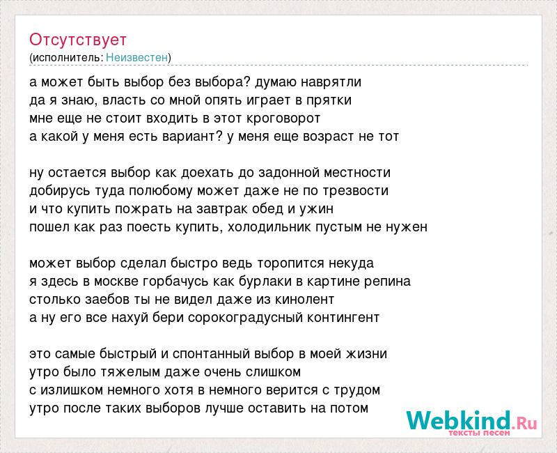 а может быть выбор без выбора? думаю наврятли да я знаю, власть со мной опять играет в прятки мне еще не стоит входить в этот кроговорот а какой у меня есть вариант? у меня еще возраст не тот ну остается выбор как доехать до задонной местности добирусь туда полюбому может даже не по трезвости и что купить пожрать на завтрак обед и ужин пошел как раз поесть купить, холодильник пустым не нужен может выбор сделал быстро ведь торопится некуда я здесь в москве горбачусь как бурлаки в картине репина столько заебов ты не видел даже из кинолент а ну его все нахуй бери сорокоградусный контингент это самые быстрый и спонтанный выбор в моей жизни утро было тяжелым даже очень слишком с излишком немного хотя в немного верится с трудом утро после таких выборов лучше оставить на потом