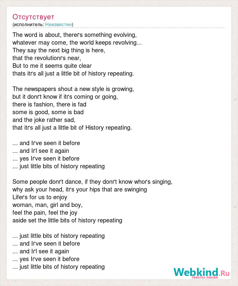The word is about, thereґs something evolving, whatever [bad word] the world keeps revolving... They say the next big thing is here, that the revolutionґs near, But to me it seems quite clear thats itґs all just a little bit of history repeating. The newspapers shout a new style is growing, but it donґt know if [bad word] or going, there is fashion, there is fad some is good, some is bad and the joke rather sad, that itґs all just a little bit of History repeating. ... and Iґve seen it before ... and Iґl see it again ... yes Iґve seen it before ... just little bits of history repeating Some people donґt dance, if they donґt know whoґs singing, why ask your head, itґs your hips that are swinging Lifeґs for us to enjoy woman, man, girl and boy, feel the pain, feel the joy aside set the little bits of history repeating ... just little bits of history repeating ... and Iґve seen it before ... and Iґl see it again ... yes Iґve seen it before ... just little bits of history repeating