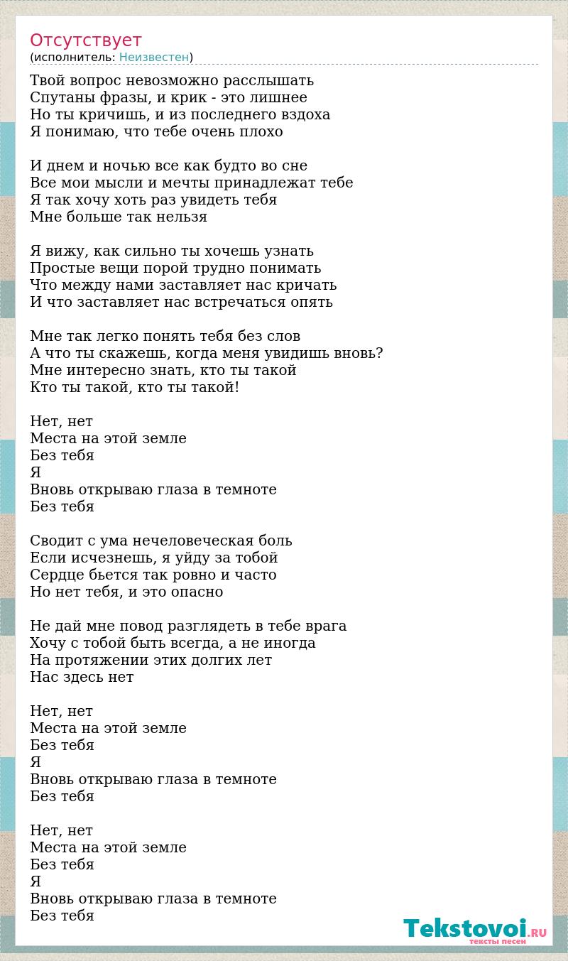 Твой вопрос невозможно расслышать Спутаны фразы, и крик - это лишнее Но ты кричишь, и из последнего вздоха Я понимаю, что тебе очень плохо И днем и ночью все как будто во сне Все мои мысли и мечты принадлежат тебе Я так хочу хоть раз увидеть тебя Мне больше так нельзя Я вижу, как сильно ты хочешь узнать Простые вещи порой трудно понимать Что между нами заставляет нас кричать И что заставляет нас встречаться опять Мне так легко понять тебя без слов А что ты скажешь, когда меня увидишь вновь? Мне интересно знать, кто ты такой Кто ты такой, кто ты такой! Нет, нет Места на этой земле Без тебя Я Вновь открываю глаза в темноте Без тебя Сводит с ума нечеловеческая боль Если исчезнешь, я уйду за тобой Сердце бьется так ровно и часто Но нет тебя, и это опасно Не дай мне повод разглядеть в тебе врага Хочу с тобой быть всегда, а не иногда На протяжении этих долгих лет Нас здесь нет Нет, нет Места на этой земле Без тебя Я Вновь открываю глаза в темноте Без тебя Нет, нет Места на этой земле Без тебя Я Вновь открываю глаза в темноте Без тебя
