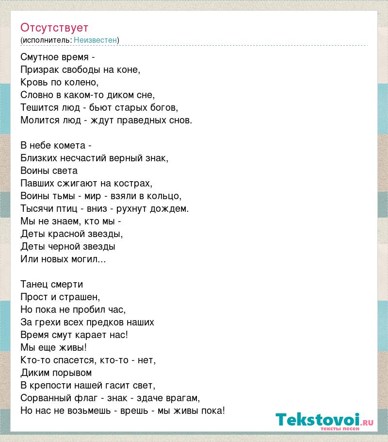 Смутное время - Призрак свободы на коне, Кровь по колено, Словно в каком-то диком сне, Тешится люд - бьют старых богов, Молится люд - ждут праведных снов. В небе комета - Близких несчастий верный знак, Воины света Павших сжигают на кострах, Воины тьмы - мир - взяли в кольцо, Тысячи птиц - вниз - рухнут дождем. Мы не знаем, кто мы - Деты красной звезды, Деты черной звезды Или новых могил... Танец смерти Прост и страшен, Но пока не пробил час, За грехи всех предков наших Время смут карает нас! Мы еще живы! Кто-то спасется, кто-то - нет, Диким порывом В крепости нашей гасит свет, Сорванный флаг - знак - здаче врагам, Но нас не возьмешь - врешь - мы живы пока!