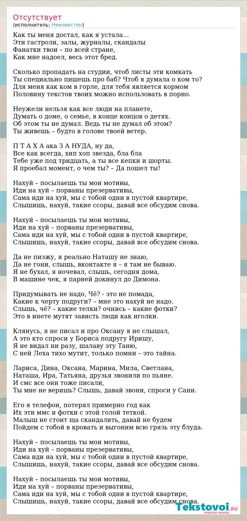Как ты меня достал, как я устала… Эти гастроли, залы, журналы, скандалы Фанатки твои – по всей стране, Как мне надоел, весь этот бред. Сколько пропадать на студии, чтоб листы эти комкать Ты специально пишешь про баб? Чтоб я думала о ком то? Для меня как ком в горле, для тебя является кормом Половину текстов твоих можно использовать в порно. Неужели нельзя как все люди на планете, Думать о доме, о семье, в конце концов о детях. Об этом ты не думал. Ведь ты не думал об этом? Ты живешь – будто в голове твоей ветер. П Т А Х А ака З А НУДА, ну да, Все как всегда, хип хоп звезда, бла бла Тебе уже под тридцать, а ты все кепки и шорты. Я проебал момент, о чем ты? – Да пошел ты! Нахуй – посылаешь ты мои мотивы, Иди на хуй – порваны презервативы, Сама иди на хуй, мы с тобой одни в пустой квартире, Слышишь, нахуй, такие ссоры, давай все обсудим снова. Нахуй – посылаешь ты мои мотивы, Иди на хуй – порваны презервативы, Сама иди на хуй, мы с тобой одни в пустой квартире, Слышишь, нахуй, такие ссоры, давай все обсудим снова. Да не пизжу, я реально Наташу не знаю, Да не гони, слышь, вконтакте я – я там не бываю. Я не бухал, я ночевал, слышь, сегодня дома, В машине чек, я парней докинул до Димона. Придумывать не надо, Чё? - это не помада, Какие к черту подруги? – мне это нахуй не надо. Слышь, чё? – какие телки? очнись – какие фотки? Это в инете мутят зависть люди как иголки. Клянусь, я не писал и про Оксану я не слышал, А это кто спроси у Бориса подругу Иришу, Я не видал ни разу, шалаву эту Таню, С ней Леха тихо мутит, только помни – это тайна. Лариса, Дина, Оксана, Марина, Мила, Светлана, Наташа, Ира, Татьяна, друзья звонили по пьяне. И смс все они тоже писали, Ты мне не веришь? Слышь, давай звони, спроси у Сани. Его я телефон, потерял примерно год как Их эти ммс и фотки с этой голой теткой. Малыш не стоит ща скандалить, давай не будем Пойдем с тобой в кровать и выгоним всю грязь эту блуда. Нахуй – посылаешь ты мои мотивы, Иди на хуй – порваны презервативы, Сама иди на хуй, мы с тобой одни в пустой квартире, Слышишь, нахуй, такие ссоры, давай все обсудим снова. Нахуй – посылаешь ты мои мотивы, Иди на хуй – порваны презервативы, Сама иди на хуй, мы с тобой одни в пустой квартире, Слышишь, нахуй, такие ссоры, давай все обсудим снова.