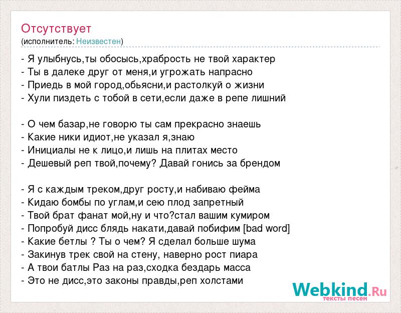 - Я улыбнусь,ты обосысь,храбрость не твой характер - Ты в далеке друг от меня,и угрожать напрасно - Приедь в мой город,обьясни,и растолкуй о жизни - Хули пиздеть с тобой в сети,если даже в репе лишний - О чем базар,не говорю ты сам прекрасно знаешь - Какие ники идиот,не указал я,знаю - Инициалы не к лицо,и лишь на плитах место - Дешевый реп твой,почему? Давай гонись за брендом - Я с каждым треком,друг росту,и набиваю фейма - Кидаю бомбы по углам,и сею плод запретный - Твой брат фанат мой,ну и что?стал вашим кумиром - Попробуй дисс блядь накати,давай побифим [bad word] - Какие бетлы ? Ты о чем? Я сделал больше шума - Закинув трек свой на стену, наверно рост пиара - А твои батлы Раз на раз,сходка бездарь масса - Это не дисс,это законы правды,реп холстами