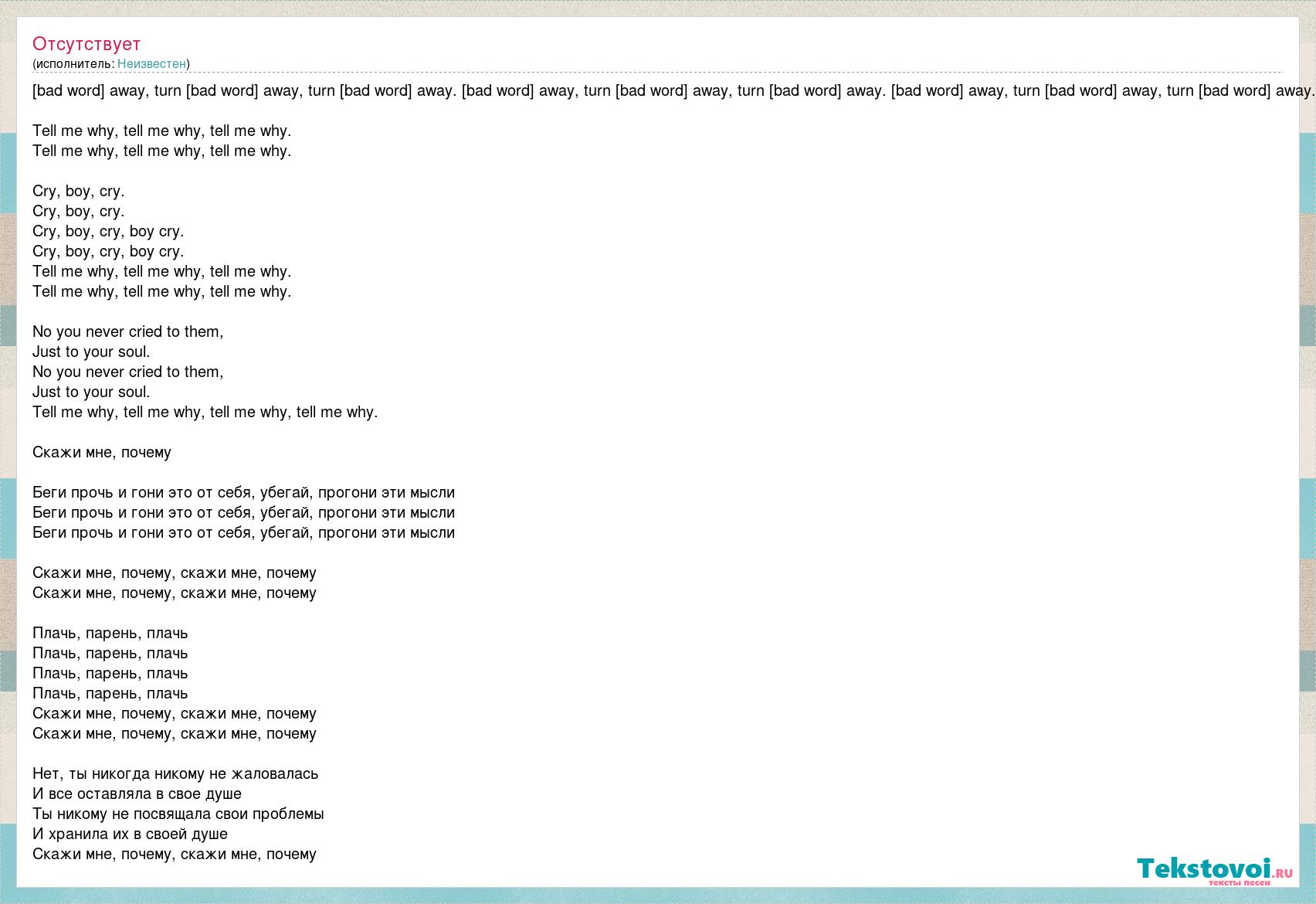 [bad word] away, turn [bad word] away, turn [bad word] away. [bad word] away, turn [bad word] away, turn [bad word] away. [bad word] away, turn [bad word] away, turn [bad word] away. Tell me why, tell me why, tell me why. Tell me why, tell me why, tell me why. Cry, boy, cry. Cry, boy, cry. Cry, boy, cry, boy cry. Cry, boy, cry, boy cry. Tell me why, tell me why, tell me why. Tell me why, tell me why, tell me why. No you never cried to them, Just to your soul. No you never cried to them, Just to your soul. Tell me why, tell me why, tell me why, tell me why. Скажи мне, почему Беги прочь и гони это от себя, убегай, прогони эти мысли Беги прочь и гони это от себя, убегай, прогони эти мысли Беги прочь и гони это от себя, убегай, прогони эти мысли Скажи мне, почему, скажи мне, почему Скажи мне, почему, скажи мне, почему Плачь, парень, плачь Плачь, парень, плачь Плачь, парень, плачь Плачь, парень, плачь Скажи мне, почему, скажи мне, почему Скажи мне, почему, скажи мне, почему Нет, ты никогда никому не жаловалась И все оставляла в свое душе Ты никому не посвящала свои проблемы И хранила их в своей душе Скажи мне, почему, скажи мне, почему
