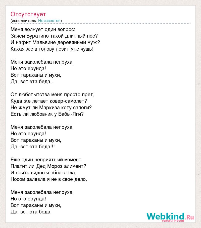 Меня волнует один вопрос: Зачем Буратино такой длинный нос? И нафиг Мальвине деревянный муж? Какая же в голову лезит мне чушь! Меня заколебала непруха, Но это ерунда! Вот тараканы и мухи, Да, вот эта беда... От любопытства меня просто прет, Куда же летает ковер-самолет? Не жмут ли Маркиза коту сапоги? Есть ли любовник у Бабы-Яги? Меня заколебала непруха, Но это ерунда! Вот тараканы и мухи, Да, вот эта беда!!! Еще один неприятный момент, Платит ли Дед Мороз алимент? И опять видно я обнаглела, Носом залезла я не в свое дело. Меня заколебала непруха, Но это ерунда! Вот тараканы и мухи, Да, вот эта беда.