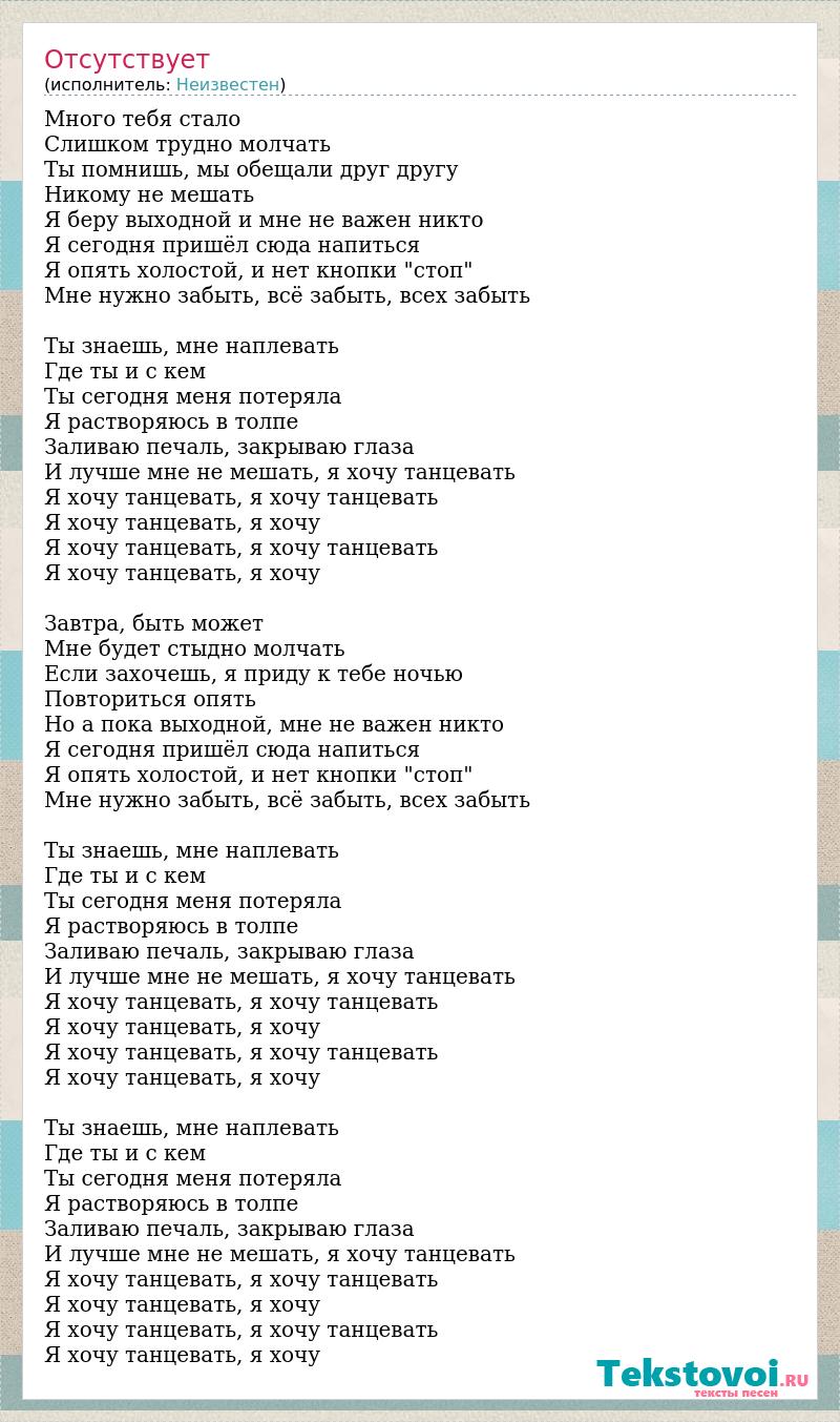 Много тебя стало Слишком трудно молчать Ты помнишь, мы обещали друг другу Никому не мешать Я беру выходной и мне не важен никто Я сегодня пришёл сюда напиться Я опять холостой, и нет кнопки "стоп" Мне нужно забыть, всё забыть, всех забыть Ты знаешь, мне наплевать Где ты и с кем Ты сегодня меня потеряла Я растворяюсь в толпе Заливаю печаль, закрываю глаза И лучше мне не мешать, я хочу танцевать Я хочу танцевать, я хочу танцевать Я хочу танцевать, я хочу Я хочу танцевать, я хочу танцевать Я хочу танцевать, я хочу Завтра, быть может Мне будет стыдно молчать Если захочешь, я приду к тебе ночью Повториться опять Но а пока выходной, мне не важен никто Я сегодня пришёл сюда напиться Я опять холостой, и нет кнопки "стоп" Мне нужно забыть, всё забыть, всех забыть Ты знаешь, мне наплевать Где ты и с кем Ты сегодня меня потеряла Я растворяюсь в толпе Заливаю печаль, закрываю глаза И лучше мне не мешать, я хочу танцевать Я хочу танцевать, я хочу танцевать Я хочу танцевать, я хочу Я хочу танцевать, я хочу танцевать Я хочу танцевать, я хочу Ты знаешь, мне наплевать Где ты и с кем Ты сегодня меня потеряла Я растворяюсь в толпе Заливаю печаль, закрываю глаза И лучше мне не мешать, я хочу танцевать Я хочу танцевать, я хочу танцевать Я хочу танцевать, я хочу Я хочу танцевать, я хочу танцевать Я хочу танцевать, я хочу