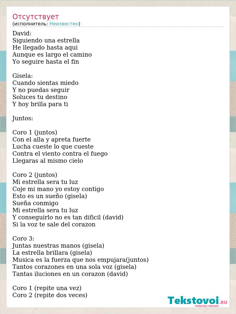 David: Siguiendo una estrella He llegado hasta aqui Aunque es largo el camino Yo seguire hasta el fin Gisela: Cuando sientas miedo Y no puedas seguir Soluces tu destino Y hoy brilla para ti Juntos: Coro 1 (juntos) Con el alla y apreta fuerte Lucha cueste lo que cueste Contra el viento contra el fuego Llegaras al mismo cielo Coro 2 (juntos) Mi estrella sera tu luz Coje mi mano yo estoy contigo Esto es un sueño (gisela) Sueña conmigo Mi estrella sera tu luz Y conseguirlo no es tan dificil (david) Si la voz te sale del corazon Coro 3: Juntas nuestras manos (gisela) La estrella brillara (gisela) Musica es la fuerza que nos empujara(juntos) Tantos corazones en una sola voz (gisela) Tantas iluciones en un corazon (david) Coro 1 (repite una vez) Coro 2 (repite dos veces)