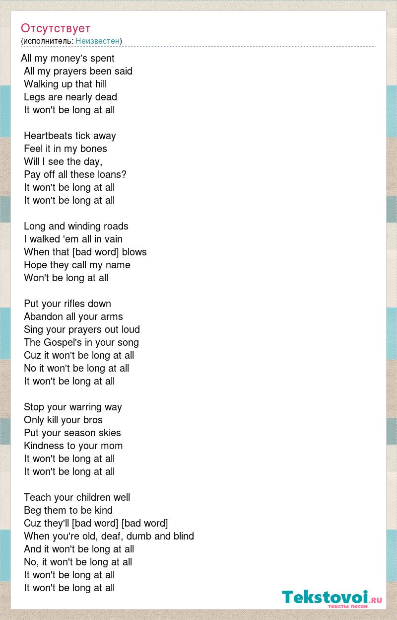 All my money's spent All my prayers been said Walking up that hill Legs are nearly dead It won't be long at all Heartbeats tick away Feel it in my bones Will I see the day, Pay off all these loans? It won't be long at all It won't be long at all Long and winding roads I walked 'em all in vain When that [bad word] blows Hope they call my name Won't be long at all Put your rifles down Abandon all your arms Sing your prayers out loud The Gospel's in your song Cuz it won't be long at all No it won't be long at all It won't be long at all Stop your warring way Only kill your bros Put your season skies Kindness to your mom It won't be long at all It won't be long at all Teach your children well Beg them to be kind Cuz they'll [bad word] [bad word] When you're old, deaf, dumb and blind And it won't be long at all No, it won't be long at all It won't be long at all It won't be long at all