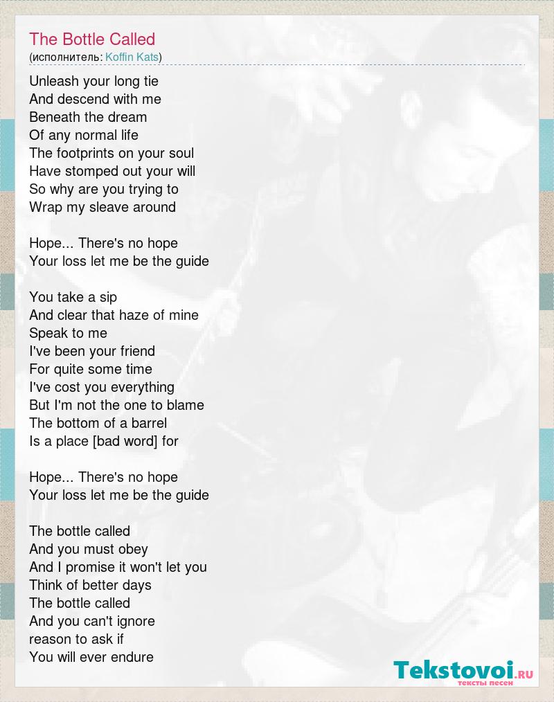 Unleash your long tie And descend with me Beneath the dream Of any normal life The footprints on your soul Have stomped out your will So why are you trying to Wrap my sleave around Hope... There's no hope Your loss let me be the guide You take a sip And clear that haze of mine Speak to me I've been your friend For quite some time I've cost you everything But I'm not the one to blame The bottom of a barrel Is a place [bad word] for Hope... There's no hope Your loss let me be the guide The bottle called And you must obey And I promise it won't let you Think of better days The bottle called And you can't ignore reason to ask if You will ever endure