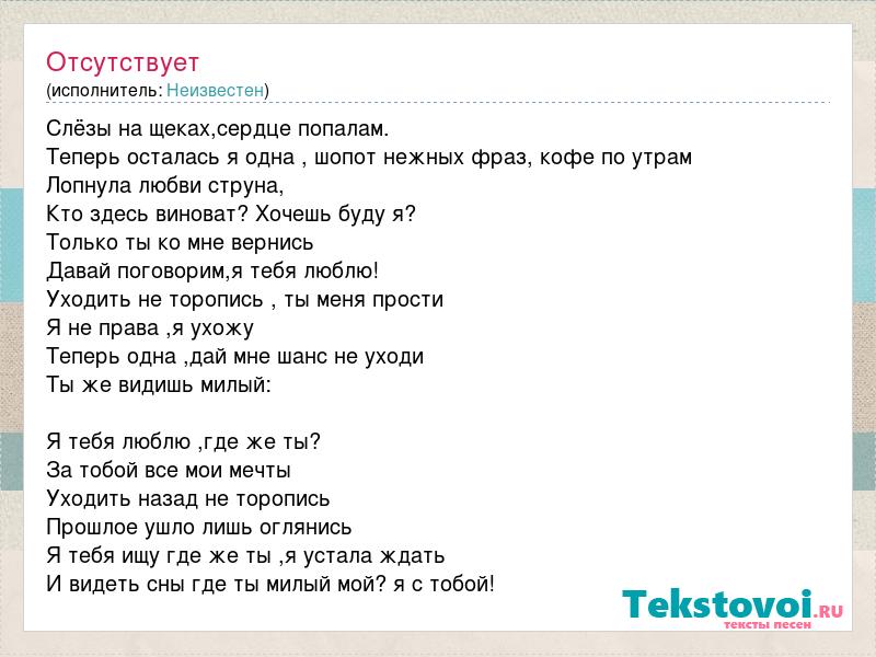 Слёзы на щеках,сердце попалам. Теперь осталась я одна , шопот нежных фраз, кофе по утрам Лопнула любви струна, Кто здесь виноват? Хочешь буду я? Только ты ко мне вернись Давай поговорим,я тебя люблю! Уходить не торопись , ты меня прости Я не права ,я ухожу Теперь одна ,дай мне шанс не уходи Ты же видишь милый: Я тебя люблю ,где же ты? За тобой все мои мечты Уходить назад не торопись Прошлое ушло лишь оглянись Я тебя ищу где же ты ,я устала ждать И видеть сны где ты милый мой? я с тобой!