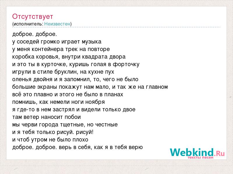 доброе. доброе. у соседей громко играет музыка у меня контейнера трек на повторе коробка коровья, внутри квадрата двора и это ты в курточке, куришь голая в форточку игрули в стиле бруклин, на кухне пух оленья двойня и я запомнил, то, чего не было большие экраны покажут нам мало, и так же на главном всё это плавно и этого не было в планах помнишь, как немели ноги ноября я где-то в нем застрял и видели только двое там ветер наносит побои мы черви города тщетные, но честные и я тебя только рисуй. рисуй! и чтоб утром не было плохо доброе. доброе. верь в себя, как я в тебя верю