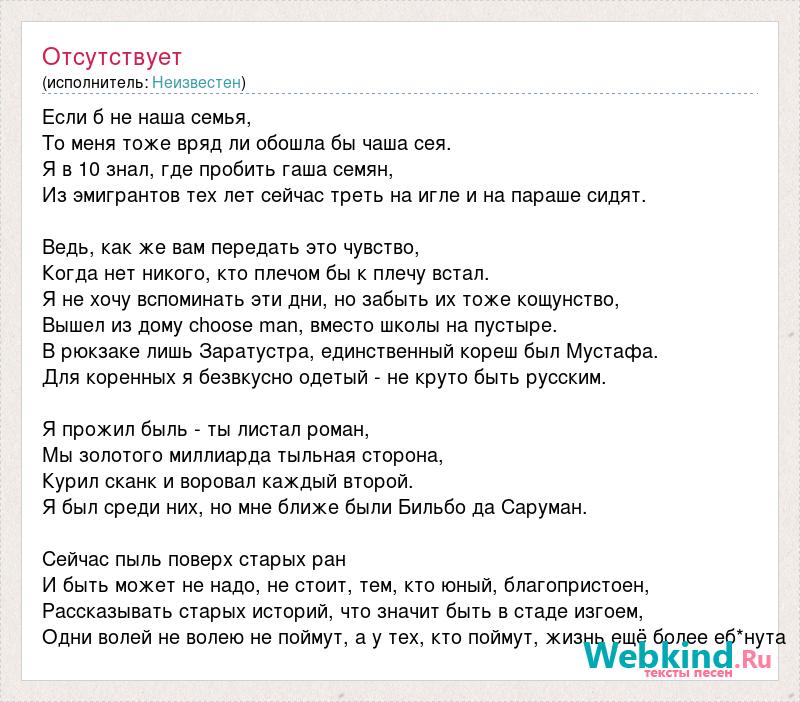 Если б не наша семья, То меня тоже вряд ли обошла бы чаша сея. Я в 10 знал, где пробить гаша семян, Из эмигрантов тех лет сейчас треть на игле и на параше сидят. Ведь, как же вам передать это чувство, Когда нет никого, кто плечом бы к плечу встал. Я не хочу вспоминать эти дни, но забыть их тоже кощунство, Вышел из дому choose man, вместо школы на пустыре. В рюкзаке лишь Заратустра, единственный кореш был Мустафа. Для коренных я безвкусно одетый - не круто быть русским. Я прожил быль - ты листал роман, Мы золотого миллиарда тыльная сторона, Курил сканк и воровал каждый второй. Я был среди них, но мне ближе были Бильбо да Саруман. Сейчас пыль поверх старых ран И быть может не надо, не стоит, тем, кто юный, благопристоен, Рассказывать старых историй, что значит быть в стаде изгоем, Одни волей не волею не поймут, а у тех, кто поймут, жизнь ещё более еб*нута