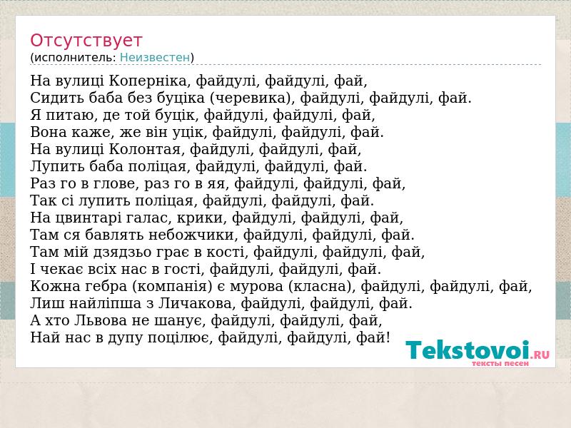На вулиці Коперніка, файдулі, файдулі, фай, Сидить баба без буціка (черевика), файдулі, файдулі, фай. Я питаю, де той буцік, файдулі, файдулі, фай, Вона каже, же він уцік, файдулі, файдулі, фай. На вулиці Колонтая, файдулі, файдулі, фай, Лупить баба поліцая, файдулі, файдулі, фай. Раз го в глове, раз го в яя, файдулі, файдулі, фай, Так сі лупить поліцая, файдулі, файдулі, фай. На цвинтарі галас, крики, файдулі, файдулі, фай, Там ся бавлять небожчики, файдулі, файдулі, фай. Там мій дзядзьо грає в кості, файдулі, файдулі, фай, І чекає всіх нас в гості, файдулі, файдулі, фай. Кожна гебра (компанія) є мурова (класна), файдулі, файдулі, фай, Лиш найліпша з Личакова, файдулі, файдулі, фай. А хто Львова не шанує, файдулі, файдулі, фай, Най нас в дупу поцілює, файдулі, файдулі, фай!
