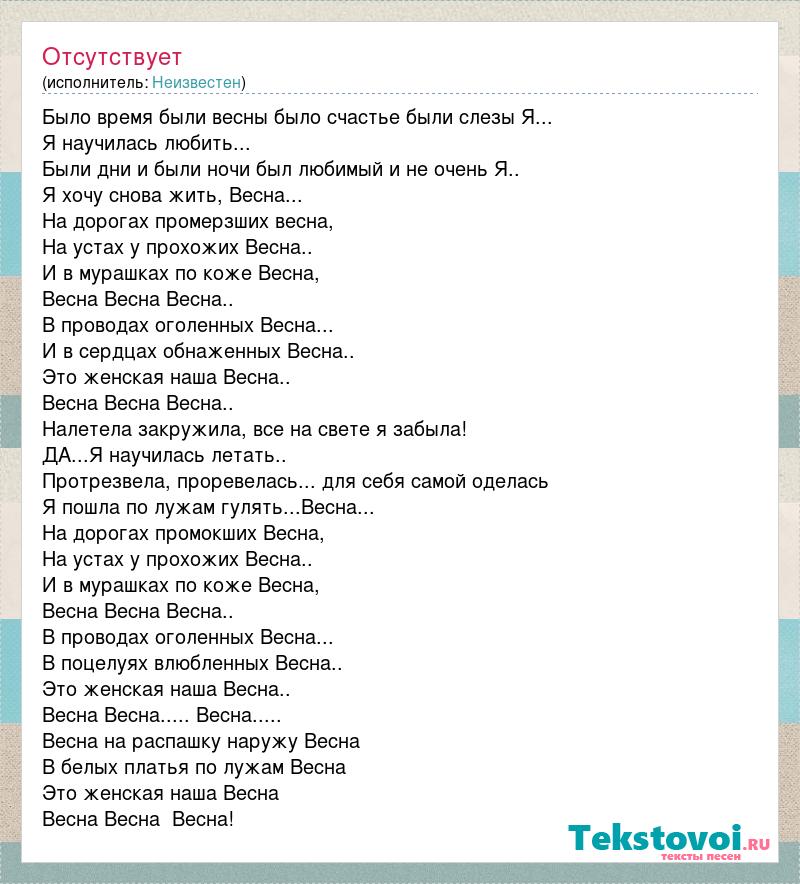 Было время были весны было счастье были слезы Я... Я научилась любить... Были дни и были ночи был любимый и не очень Я.. Я хочу снова жить, Весна... На дорогах промерзших весна, На устах у прохожих Весна.. И в мурашках по коже Весна, Весна Весна Весна.. В проводах оголенных Весна... И в сердцах обнаженных Весна.. Это женская наша Весна.. Весна Весна Весна.. Налетела закружила, все на свете я забыла! ДА...Я научилась летать.. Протрезвела, проревелась... для себя самой оделась Я пошла по лужам гулять...Весна... На дорогах промокших Весна, На устах у прохожих Весна.. И в мурашках по коже Весна, Весна Весна Весна.. В проводах оголенных Весна... В поцелуях влюбленных Весна.. Это женская наша Весна.. Весна Весна..... Весна..... Весна на распашку наружу Весна В белых платья по лужам Весна Это женская наша Весна Весна Весна Весна!