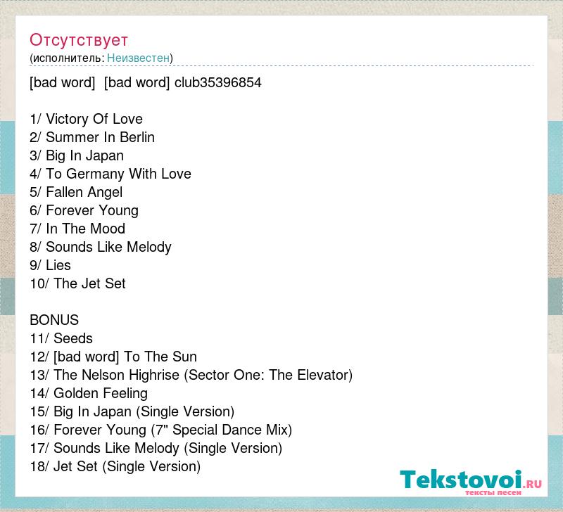 [bad word] [bad word] club35396854 1/ Victory Of Love 2/ Summer In Berlin 3/ Big In Japan 4/ To Germany With Love 5/ Fallen Angel 6/ Forever Young 7/ In The Mood 8/ Sounds Like Melody 9/ Lies 10/ The Jet Set BONUS 11/ Seeds 12/ [bad word] To The Sun 13/ The Nelson Highrise (Sector One: The Elevator) 14/ Golden Feeling 15/ Big In Japan (Single Version) 16/ Forever Young (7" Special Dance Mix) 17/ Sounds Like Melody (Single Version) 18/ Jet Set (Single Version)