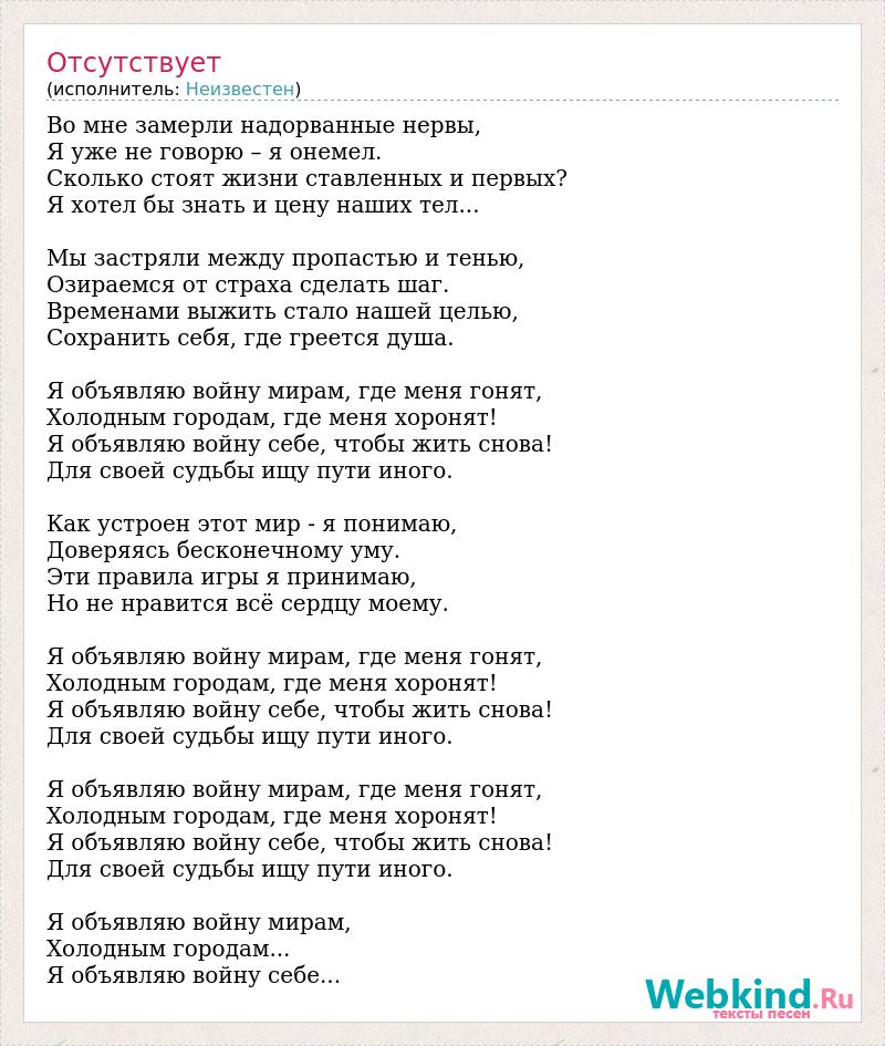 Во мне замерли надорванные нервы, Я уже не говорю – я онемел. Сколько стоят жизни ставленных и первых? Я хотел бы знать и цену наших тел... Мы застряли между пропастью и тенью, Озираемся от страха сделать шаг. Временами выжить стало нашей целью, Сохранить себя, где греется душа. Я объявляю войну мирам, где меня гонят, Холодным городам, где меня хоронят! Я объявляю войну себе, чтобы жить снова! Для своей судьбы ищу пути иного. Как устроен этот мир - я понимаю, Доверяясь бесконечному уму. Эти правила игры я принимаю, Но не нравится всё сердцу моему. Я объявляю войну мирам, где меня гонят, Холодным городам, где меня хоронят! Я объявляю войну себе, чтобы жить снова! Для своей судьбы ищу пути иного. Я объявляю войну мирам, где меня гонят, Холодным городам, где меня хоронят! Я объявляю войну себе, чтобы жить снова! Для своей судьбы ищу пути иного. Я объявляю войну мирам, Холодным городам... Я объявляю войну себе...