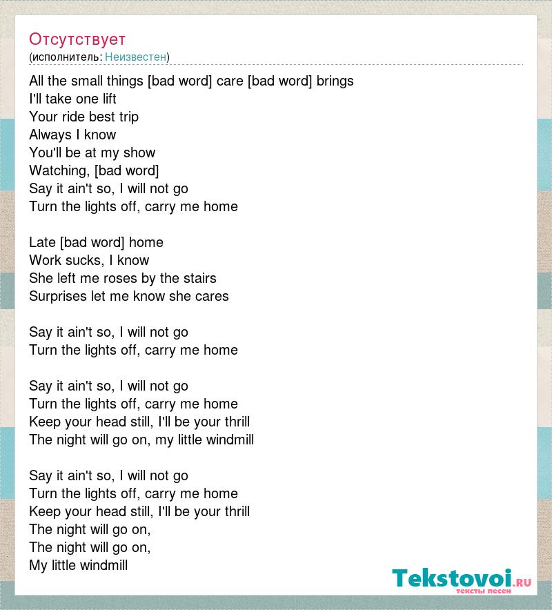 All the small things [bad word] care [bad word] brings I'll take one lift Your ride best trip Always I know You'll be at my show Watching, [bad word] Say it ain't so, I will not go Turn the lights off, carry me home Late [bad word] home Work sucks, I know She left me roses by the stairs Surprises let me know she cares Say it ain't so, I will not go Turn the lights off, carry me home Say it ain't so, I will not go Turn the lights off, carry me home Keep your head still, I'll be your thrill The night will go on, my little windmill Say it ain't so, I will not go Turn the lights off, carry me home Keep your head still, I'll be your thrill The night will go on, The night will go on, My little windmill