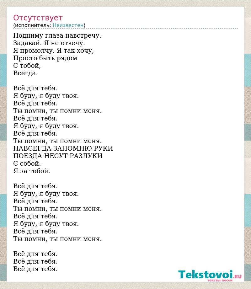 Подниму глаза навстречу. Задавай. Я не отвечу. Я промолчу. Я так хочу, Просто быть рядом С тобой, Всегда. Всё для тебя. Я буду, я буду твоя. Всё для тебя. Ты помни, ты помни меня. Всё для тебя. Я буду, я буду твоя. Всё для тебя. Ты помни, ты помни меня. НАВСЕГДА ЗАПОМНЮ РУКИ ПОЕЗДА НЕСУТ РАЗЛУКИ С собой. Я за тобой. Всё для тебя. Я буду, я буду твоя. Всё для тебя. Ты помни, ты помни меня. Всё для тебя. Я буду, я буду твоя. Всё для тебя. Ты помни, ты помни меня. Всё для тебя. Всё для тебя. Всё для тебя.
