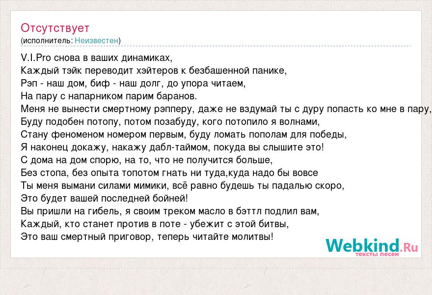 V.I.Pro снова в ваших динамиках, Каждый тэйк переводит хэйтеров к безбашенной панике, Рэп - наш дом, биф - наш долг, до упора читаем, На пару с напарником парим баранов. Меня не вынести смертному рэпперу, даже не вздумай ты с дуру попасть ко мне в пару, Буду подобен потопу, потом позабуду, кого потопило я волнами, Стану феноменом номером первым, буду ломать пополам для победы, Я наконец докажу, накажу дабл-таймом, покуда вы слышите это! С дома на дом спорю, на то, что не получится больше, Без стопа, без опыта топотом гнать ни туда,куда надо бы вовсе Ты меня вымани силами мимики, всё равно будешь ты падалью скоро, Это будет вашей последней бойней! Вы пришли на гибель, я своим треком масло в бэттл подлил вам, Каждый, кто станет против в поте - убежит с этой битвы, Это ваш смертный приговор, теперь читайте молитвы!