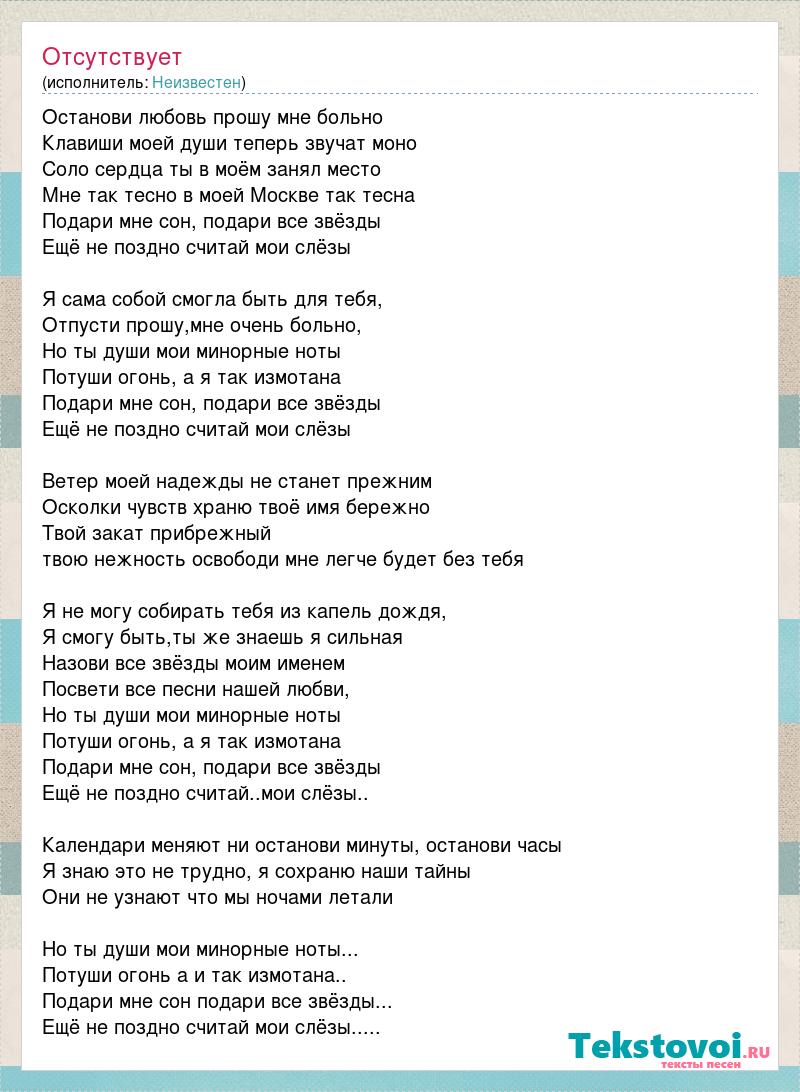 Останови любовь прошу мне больно Клавиши моей души теперь звучат моно Соло сердца ты в моём занял место Мне так тесно в моей Москве так тесна Подари мне сон, подари все звёзды Ещё не поздно считай мои слёзы Я сама собой смогла быть для тебя, Отпусти прошу,мне очень больно, Но ты души мои минорные ноты Потуши огонь, а я так измотана Подари мне сон, подари все звёзды Ещё не поздно считай мои слёзы Ветер моей надежды не станет прежним Осколки чувств храню твоё имя бережно Твой закат прибрежный твою нежность освободи мне легче будет без тебя Я не могу собирать тебя из капель дождя, Я смогу быть,ты же знаешь я сильная Назови все звёзды моим именем Посвети все песни нашей любви, Но ты души мои минорные ноты Потуши огонь, а я так измотана Подари мне сон, подари все звёзды Ещё не поздно считай..мои слёзы.. Календари меняют ни останови минуты, останови часы Я знаю это не трудно, я сохраню наши тайны Они не узнают что мы ночами летали Но ты души мои минорные ноты... Потуши огонь а и так измотана.. Подари мне сон подари все звёзды... Ещё не поздно считай мои слёзы.....