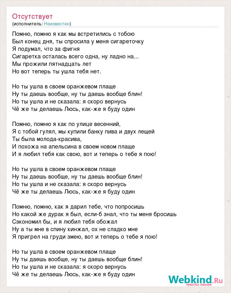 Помню, помню я как мы встретились с тобою Был конец дня, ты спросила у меня сигареточку Я подумал, что за фигня Сигаретка осталась всего одна, ну ладно на... Мы прожили пятнадцать лет Но вот теперь ты ушла тебя нет. Но ты ушла в своем оранжевом плаще Ну ты даешь вообще, ну ты даешь вообще блин! Но ты ушла и не сказала: я скоро вернусь Чё же ты делаешь Люсь, как-же я буду один Помню, помню я как по улице весенний, Я с тобой гулял, мы купили банку пива и двух лещей Ты была молода-красива, И похожа на апельсина в своем новом плаще И я любил тебя как свою, вот и теперь о тебе я пою! Но ты ушла в своем оранжевом плаще Ну ты даешь вообще, ну ты даешь вообще блин! Но ты ушла и не сказала: я скоро вернусь Чё же ты делаешь Люсь, как-же я буду один Помню, помню, как я дарил тебе, что попросишь Но какой же дурак я был, если-б знал, что ты меня бросишь Сэкономил бы, и я любил тебя обожал Ну а ты мне в спину кинжал, ох не сладко мне Я пригрел на груди змею, вот и теперь о тебе я пою! Но ты ушла в своем оранжевом плаще Ну ты даешь вообще, ну ты даешь вообще блин! Но ты ушла и не сказала: я скоро вернусь Чё же ты делаешь Люсь, как-же я буду один