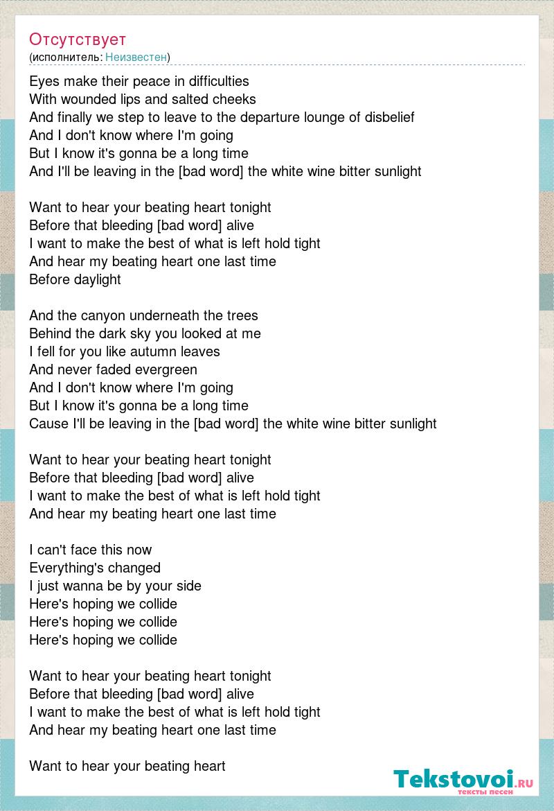 Eyes make their peace in difficulties With wounded lips and salted cheeks And finally we step to leave to the departure lounge of disbelief And I don't know where I'm going But I know it's gonna be a long time And I'll be leaving in the [bad word] the white wine bitter sunlight Want to hear your beating heart tonight Before that bleeding [bad word] alive I want to make the best of what is left hold tight And hear my beating heart one last time Before daylight And the canyon underneath the trees Behind the dark sky you looked at me I fell for you like autumn leaves And never faded evergreen And I don't know where I'm going But I know it's gonna be a long time Cause I'll be leaving in the [bad word] the white wine bitter sunlight Want to hear your beating heart tonight Before that bleeding [bad word] alive I want to make the best of what is left hold tight And hear my beating heart one last time I can't face this now Everything's changed I just wanna be by your side Here's hoping we collide Here's hoping we collide Here's hoping we collide Want to hear your beating heart tonight Before that bleeding [bad word] alive I want to make the best of what is left hold tight And hear my beating heart one last time Want to hear your beating heart