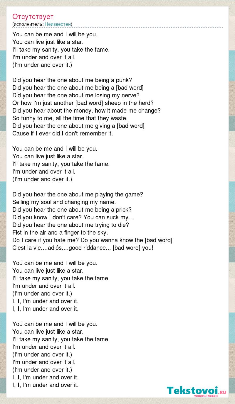You can be me and I will be you. You can live just like a star. I'll take my sanity, you take the fame. I'm under and over it all. (I'm under and over it.) Did you hear the one about me being a punk? Did you hear the one about me being a [bad word] Did you hear the one about me losing my nerve? Or how I'm just another [bad word] sheep in the herd? Did you hear about the money, how it made me change? So funny to me, all the time that they waste. Did you hear the one about me giving a [bad word] Cause if I ever did I don't remember it. You can be me and I will be you. You can live just like a star. I'll take my sanity, you take the fame. I'm under and over it all. (I'm under and over it.) Did you hear the one about me playing the game? Selling my soul and changing my name. Did you hear the one about me being a prick? Did you know I don't care? You can suck my... Did you hear the one about me trying to die? Fist in the air and a finger to the sky. Do I care if you hate me? Do you wanna know the [bad word] C'est la vie....adiós....good riddance... [bad word] you! You can be me and I will be you. You can live just like a star. I'll take my sanity, you take the fame. I'm under and over it all. (I'm under and over it.) I, I, I'm under and over it. I, I, I'm under and over it. You can be me and I will be you. You can live just like a star. I'll take my sanity, you take the fame. I'm under and over it all. (I'm under and over it.) I'm under and over it all. (I'm under and over it.) I, I, I'm under and over it. I, I, I'm under and over it.