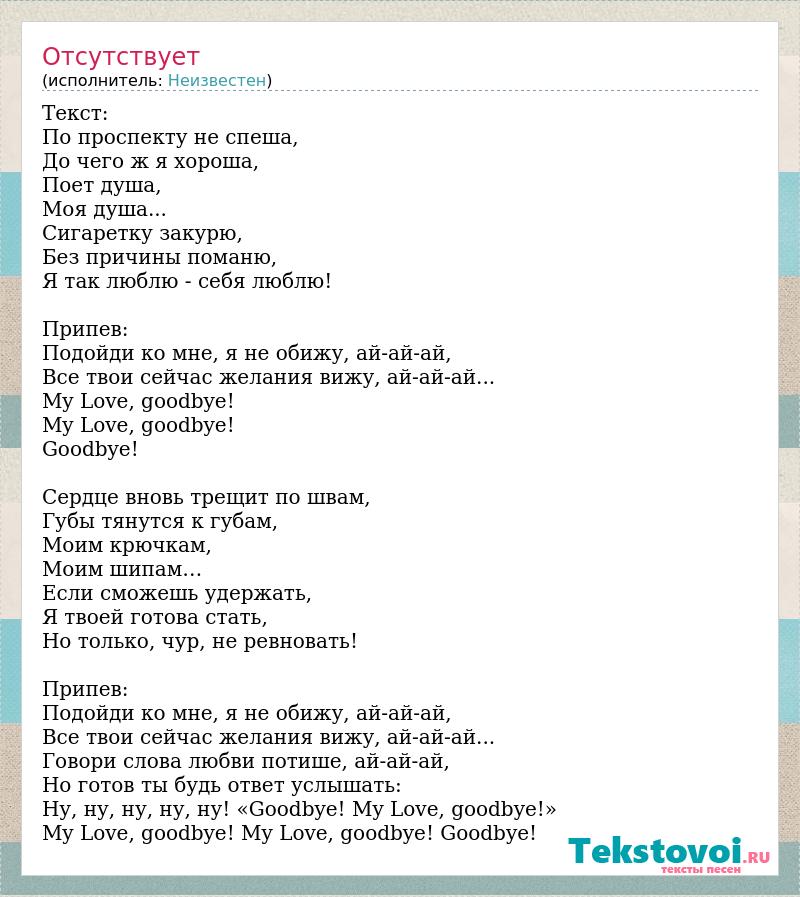 Текст: По проспекту не спеша, До чего ж я хороша, Поет душа, Моя душа... Сигаретку закурю, Без причины поманю, Я так люблю - себя люблю! Припев: Подойди ко мне, я не обижу, ай-ай-ай, Все твои сейчас желания вижу, ай-ай-ай... My Love, goodbye! My Love, goodbye! Goodbye! Сердце вновь трещит по швам, Губы тянутся к губам, Моим крючкам, Моим шипам… Если сможешь удержать, Я твоей готова стать, Но только, чур, не ревновать! Припев: Подойди ко мне, я не обижу, ай-ай-ай, Все твои сейчас желания вижу, ай-ай-ай... Говори слова любви потише, ай-ай-ай, Но готов ты будь ответ услышать: Ну, ну, ну, ну, ну! «Goodbye! My Love, goodbye!» My Love, goodbye! My Love, goodbye! Goodbye!