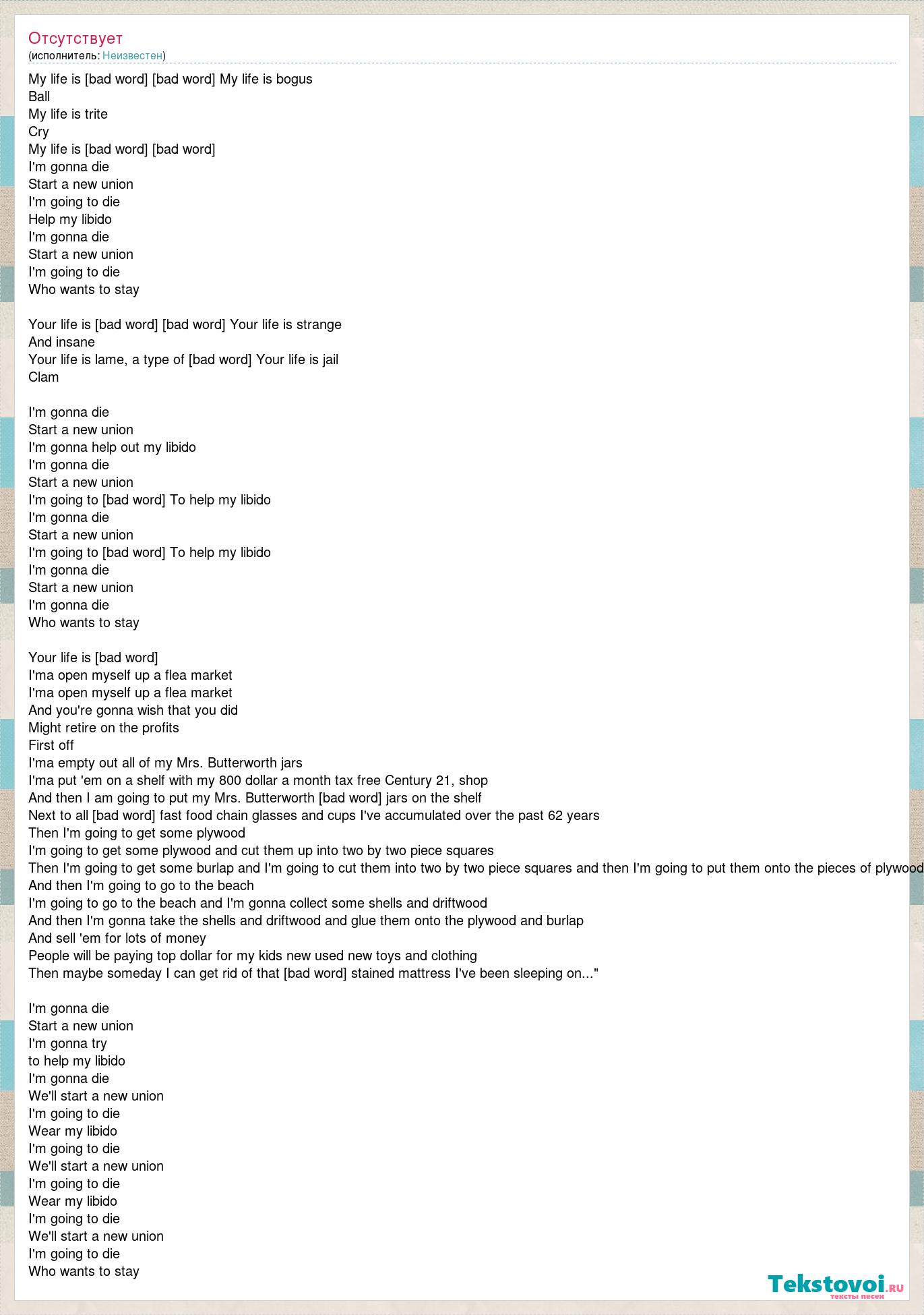 My life is [bad word] [bad word] My life is bogus Ball My life is trite Cry My life is [bad word] [bad word] I'm gonna die Start a new union I'm going to die Help my libido I'm gonna die Start a new union I'm going to die Who wants to stay Your life is [bad word] [bad word] Your life is strange And insane Your life is lame, a type of [bad word] Your life is jail Clam I'm gonna die Start a new union I'm gonna help out my libido I'm gonna die Start a new union I'm going to [bad word] To help my libido I'm gonna die Start a new union I'm going to [bad word] To help my libido I'm gonna die Start a new union I'm gonna die Who wants to stay Your life is [bad word] I'ma open myself up a flea market I'ma open myself up a flea market And you're gonna wish that you did Might retire on the profits First off I'ma empty out all of my Mrs. Butterworth jars I'ma put 'em on a shelf with my 800 dollar a month tax free Century 21, shop And then I am going to put my Mrs. Butterworth [bad word] jars on the shelf Next to all [bad word] fast food chain glasses and cups I've accumulated over the past 62 years Then I'm going to get some plywood I'm going to get some plywood and cut them up into two by two piece squares Then I'm going to get some burlap and I'm going to cut them into two by two piece squares and then I'm going to put them onto the pieces of plywood And then I'm going to go to the beach I'm going to go to the beach and I'm gonna collect some shells and driftwood And then I'm gonna take the shells and driftwood and glue them onto the plywood and burlap And sell 'em for lots of money People will be paying top dollar for my kids new used new toys and clothing Then maybe someday I can get rid of that [bad word] stained mattress I've been sleeping on..." I'm gonna die Start a new union I'm gonna try to help my libido I'm gonna die We'll start a new union I'm going to die Wear my libido I'm going to die We'll start a new union I'm going to die Wear my libido I'm going to die We'll start a new union I'm going to die Who wants to stay