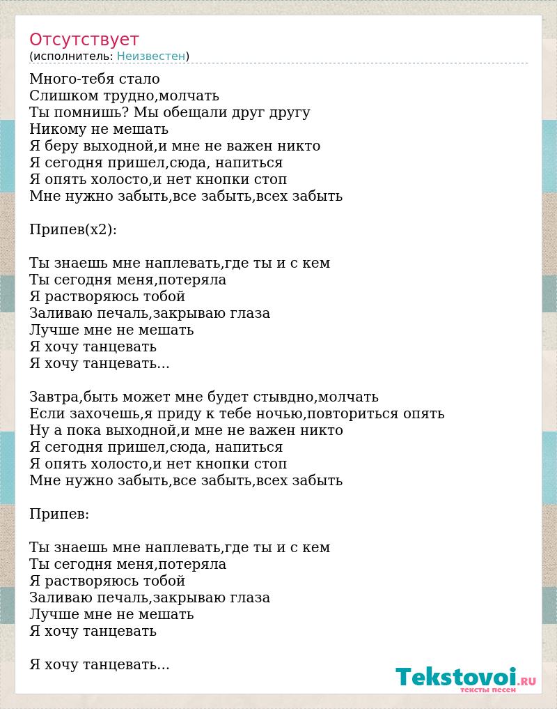 Много-тебя стало Слишком трудно,молчать Ты помнишь? Мы обещали друг другу Никому не мешать Я беру выходной,и мне не важен никто Я сегодня пришел,сюда, напиться Я опять холосто,и нет кнопки стоп Мне нужно забыть,все забыть,всех забыть Припев(х2): Ты знаешь мне наплевать,где ты и с кем Ты сегодня меня,потеряла Я растворяюсь тобой Заливаю печаль,закрываю глаза Лучше мне не мешать Я хочу танцевать Я хочу танцевать... Завтра,быть может мне будет стывдно,молчать Если захочешь,я приду к тебе ночью,повториться опять Ну а пока выходной,и мне не важен никто Я сегодня пришел,сюда, напиться Я опять холосто,и нет кнопки стоп Мне нужно забыть,все забыть,всех забыть Припев: Ты знаешь мне наплевать,где ты и с кем Ты сегодня меня,потеряла Я растворяюсь тобой Заливаю печаль,закрываю глаза Лучше мне не мешать Я хочу танцевать Я хочу танцевать...