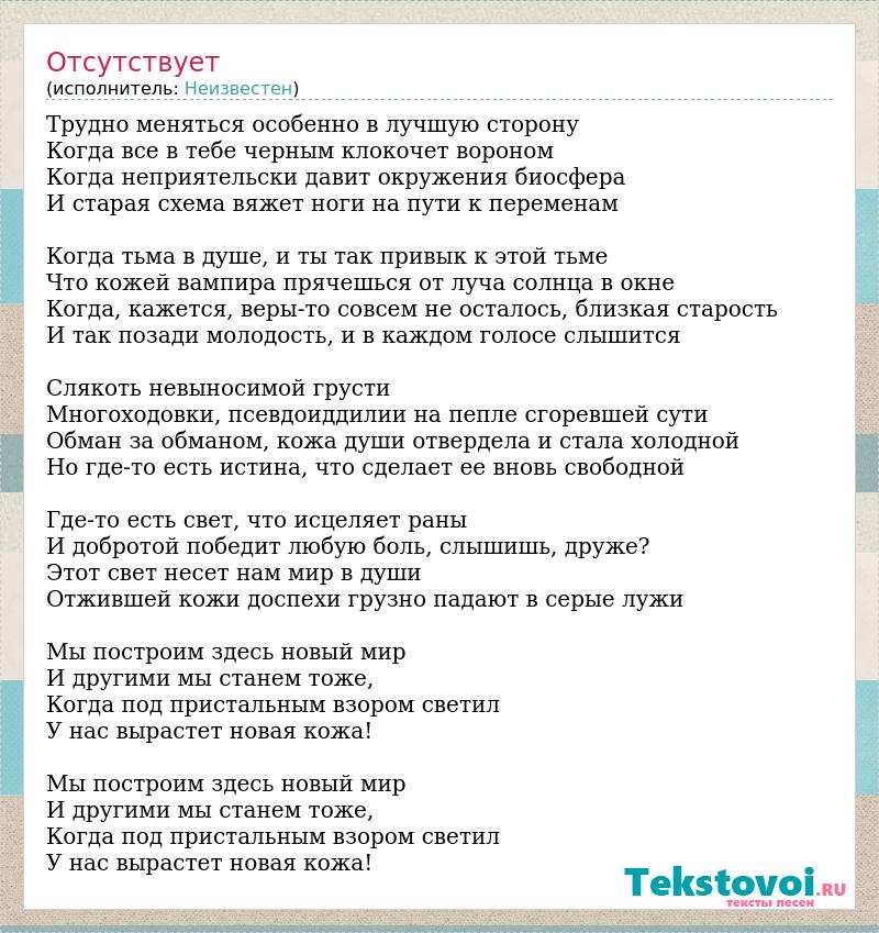 Трудно меняться особенно в лучшую сторону Когда все в тебе черным клокочет вороном Когда неприятельски давит окружения биосфера И старая схема вяжет ноги на пути к переменам Когда тьма в душе, и ты так привык к этой тьме Что кожей вампира прячешься от луча солнца в окне Когда, кажется, веры-то совсем не осталось, близкая старость И так позади молодость, и в каждом голосе слышится Слякоть невыносимой грусти Многоходовки, псевдоиддилии на пепле сгоревшей сути Обман за обманом, кожа души отвердела и стала холодной Но где-то есть истина, что сделает ее вновь свободной Где-то есть свет, что исцеляет раны И добротой победит любую боль, слышишь, друже? Этот свет несет нам мир в души Отжившей кожи доспехи грузно падают в серые лужи Мы построим здесь новый мир И другими мы станем тоже, Когда под пристальным взором светил У нас вырастет новая кожа! Мы построим здесь новый мир И другими мы станем тоже, Когда под пристальным взором светил У нас вырастет новая кожа!