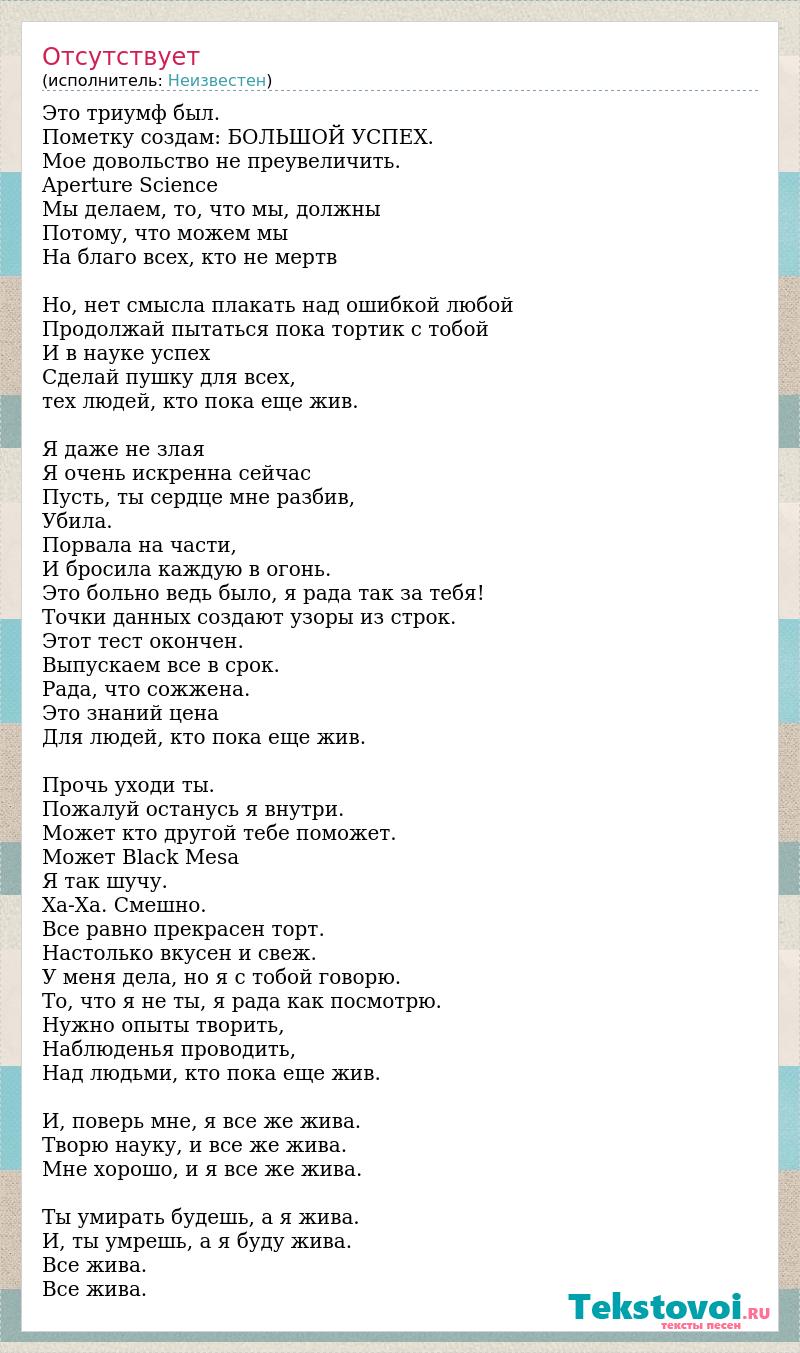 Это триумф был. Пометку создам: БОЛЬШОЙ УСПЕХ. Мое довольство не преувеличить. Aperture Science Мы делаем, то, что мы, должны Потому, что можем мы На благо всех, кто не мертв Но, нет смысла плакать над ошибкой любой Продолжай пытаться пока тортик с тобой И в науке успех Сделай пушку для всех, тех людей, кто пока еще жив. Я даже не злая Я очень искренна сейчас Пусть, ты сердце мне разбив, Убила. Порвала на части, И бросила каждую в огонь. Это больно ведь было, я рада так за тебя! Точки данных создают узоры из строк. Этот тест окончен. Выпускаем все в срок. Рада, что сожжена. Это знаний цена Для людей, кто пока еще жив. Прочь уходи ты. Пожалуй останусь я внутри. Может кто другой тебе поможет. Может Black Mesa Я так шучу. Ха-Ха. Смешно. Все равно прекрасен торт. Настолько вкусен и свеж. У меня дела, но я с тобой говорю. То, что я не ты, я рада как посмотрю. Нужно опыты творить, Наблюденья проводить, Над людьми, кто пока еще жив. И, поверь мне, я все же жива. Творю науку, и все же жива. Мне хорошо, и я все же жива. Ты умирать будешь, а я жива. И, ты умрешь, а я буду жива. Все жива. Все жива.