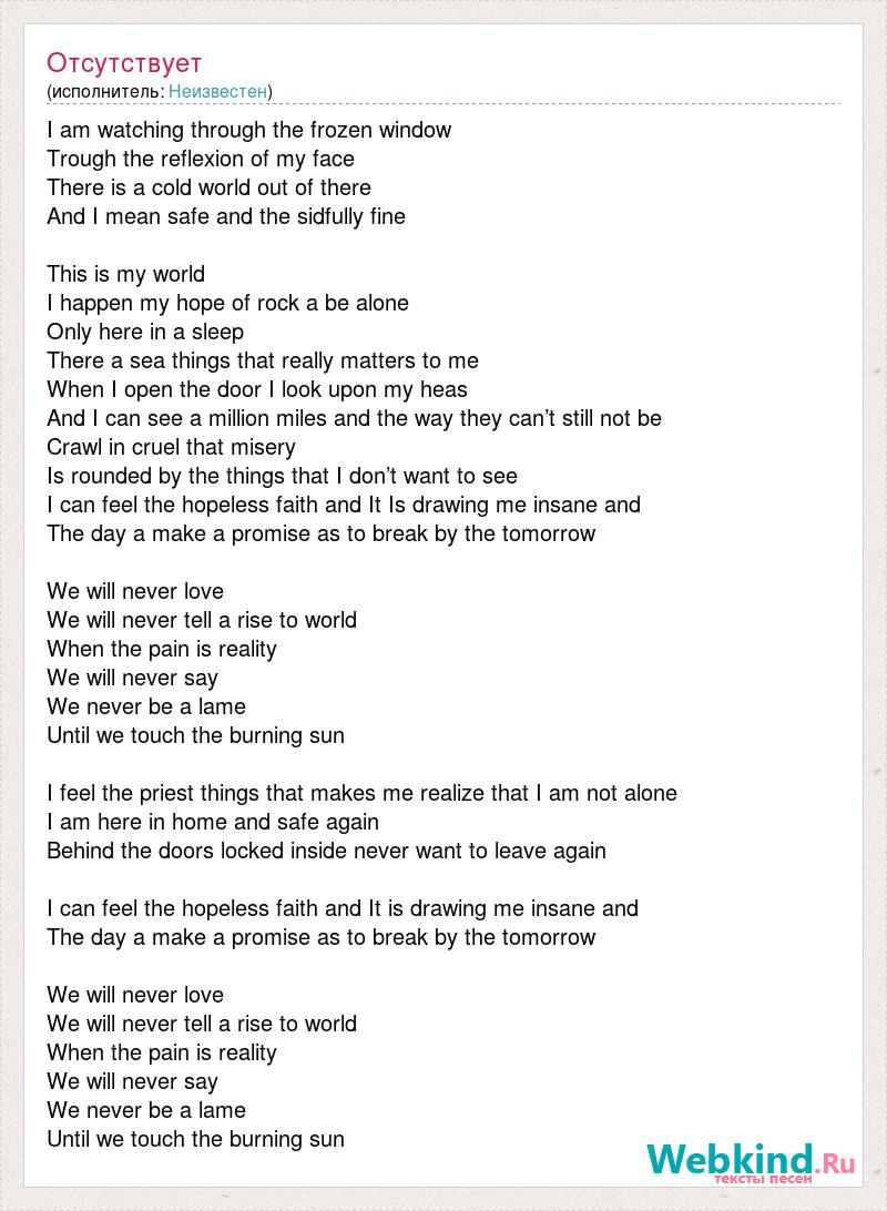 I am watching through the frozen window Trough the reflexion of my face There is a cold world out of there And I mean safe and the sidfully fine This is my world I happen my hope of rock a be alone Only here in a sleep There a sea things that really matters to me When I open the door I look upon my heas And I can see a million miles and the way they can’t still not be Crawl in [bad word] that misery Is rounded by the things that I don’t want to see I can feel the hopeless faith and It Is drawing me insane and The day a make a promise as to break by the tomorrow We will never love We will never tell a rise to world When the pain is reality We will never say We never be a lame Until we touch the burning sun I feel the priest things that makes me realize that I am not alone I am here in home and safe again Behind the doors locked inside never want to leave again I can feel the hopeless faith and It is drawing me insane and The day a make a promise as to break by the tomorrow We will never love We will never tell a rise to world When the pain is reality We will never say We never be a lame Until we touch the burning sun
