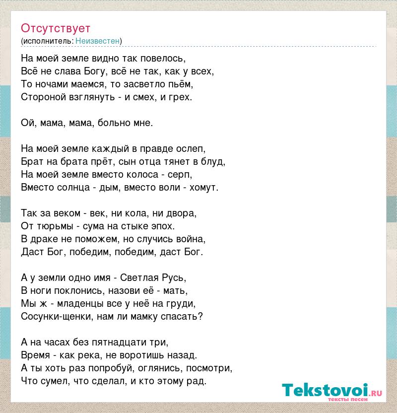На моей земле видно так повелось, Всё не слава Богу, всё не так, как у всех, То ночами маемся, то засветло пьём, Стороной взглянуть - и смех, и грех. Ой, мама, мама, больно мне. На моей земле каждый в правде ослеп, Брат на брата прёт, сын отца тянет в блуд, На моей земле вместо колоса - серп, Вместо солнца - дым, вместо воли - хомут. Так за веком - век, ни кола, ни двора, От тюрьмы - сума на стыке эпох. В драке не поможем, но случись война, Даст Бог, победим, победим, даст Бог. А у земли одно имя - Светлая Русь, В ноги поклонись, назови её - мать, Мы ж - младенцы все у неё на груди, Сосунки-щенки, нам ли мамку спасать? А на часах без пятнадцати три, Время - как река, не воротишь назад. А ты хоть раз попробуй, оглянись, посмотри, Что сумел, что сделал, и кто этому рад.