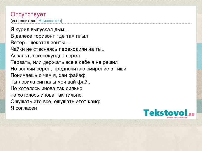 Я курил выпускал дым... В далеке горизонт где там плыл Ветер.. щекотал зонты... Чайки не стесняясь переходили на ты.. Асвальт, ежесекундно серел Терзать, или держать все в себе я не решил Но воплям серен, предпочитаю смирение в тиши Понимаешь о чем я, хай файвф Ты ловила сигналы мои вай фай.. Но хотелось инова так сильно но хотелось инова так тильно Ощущать это все, ощущать этот кайф Я согласен