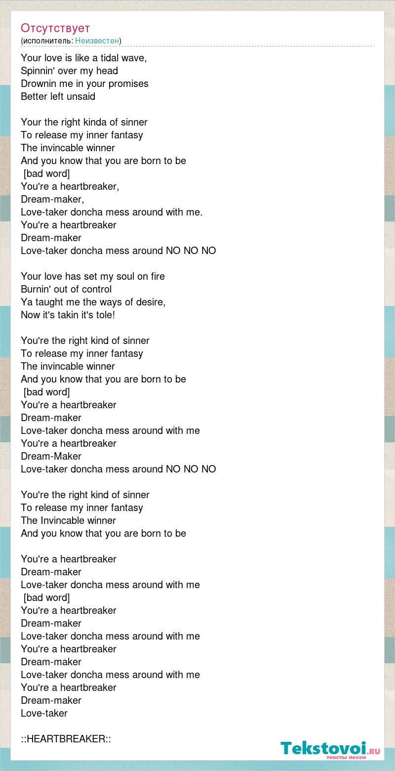 Your love is like a tidal wave, Spinnin' over my head Drownin me in your promises Better left unsaid Your the right kinda of sinner To release my inner fantasy The invincable winner And you know that you are born to be [bad word] You're a heartbreaker, Dream-maker, Love-taker doncha mess around with me. You're a heartbreaker Dream-maker Love-taker doncha mess around NO NO NO Your love has set my soul on fire Burnin' out of control Ya taught me the ways of desire, Now it's takin it's tole! You're the right kind of sinner To release my inner fantasy The invincable winner And you know that you are born to be [bad word] You're a heartbreaker Dream-maker Love-taker doncha mess around with me You're a heartbreaker Dream-Maker Love-taker doncha mess around NO NO NO You're the right kind of sinner To release my inner fantasy The Invincable winner And you know that you are born to be You're a heartbreaker Dream-maker Love-taker doncha mess around with me [bad word] You're a heartbreaker Dream-maker Love-taker doncha mess around with me You're a heartbreaker Dream-maker Love-taker doncha mess around with me You're a heartbreaker Dream-maker Love-taker ::HEARTBREAKER::