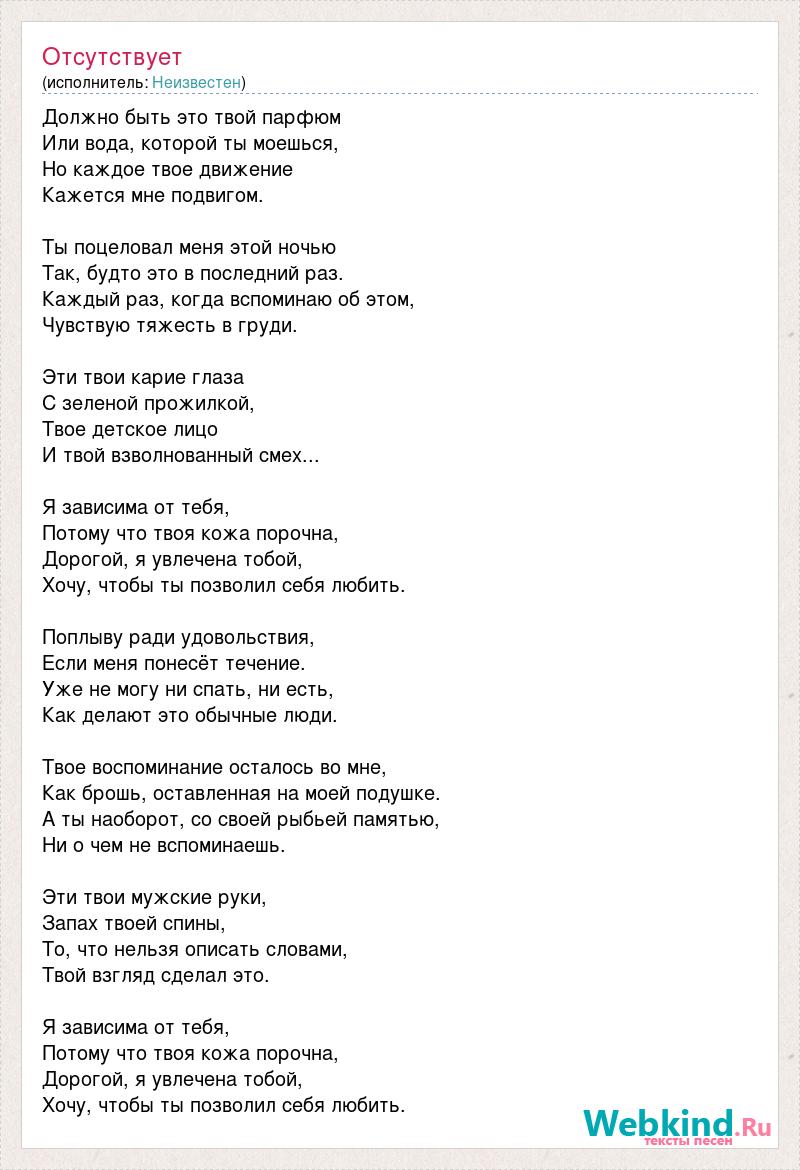 Должно быть это твой парфюм Или вода, которой ты моешься, Но каждое твое движение Кажется мне подвигом. Ты поцеловал меня этой ночью Так, будто это в последний раз. Каждый раз, когда вспоминаю об этом, Чувствую тяжесть в груди. Эти твои карие глаза С зеленой прожилкой, Твое детское лицо И твой взволнованный смех... Я зависима от тебя, Потому что твоя кожа порочна, Дорогой, я увлечена тобой, Хочу, чтобы ты позволил себя любить. Поплыву ради удовольствия, Если меня понесёт течение. Уже не могу ни спать, ни есть, Как делают это обычные люди. Твое воспоминание осталось во мне, Как брошь, оставленная на моей подушке. А ты наоборот, со своей рыбьей памятью, Ни о чем не вспоминаешь. Эти твои мужские руки, Запах твоей спины, То, что нельзя описать словами, Твой взгляд сделал это. Я зависима от тебя, Потому что твоя кожа порочна, Дорогой, я увлечена тобой, Хочу, чтобы ты позволил себя любить.
