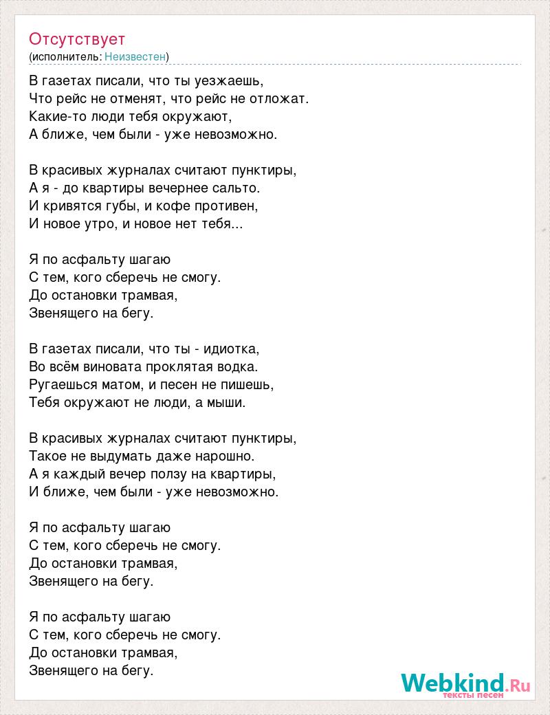 В газетах писали, что ты уезжаешь, Что рейс не отменят, что рейс не отложат. Какие-то люди тебя окружают, А ближе, чем были - уже невозможно. В красивых журналах считают пунктиры, А я - до квартиры вечернее сальто. И кривятся губы, и кофе противен, И новое утро, и новое нет тебя... Я по асфальту шагаю С тем, кого сберечь не смогу. До остановки трамвая, Звенящего на бегу. В газетах писали, что ты - идиотка, Во всём виновата проклятая водка. Ругаешься матом, и песен не пишешь, Тебя окружают не люди, а мыши. В красивых журналах считают пунктиры, Такое не выдумать даже нарошно. А я каждый вечер ползу на квартиры, И ближе, чем были - уже невозможно. Я по асфальту шагаю С тем, кого сберечь не смогу. До остановки трамвая, Звенящего на бегу. Я по асфальту шагаю С тем, кого сберечь не смогу. До остановки трамвая, Звенящего на бегу.