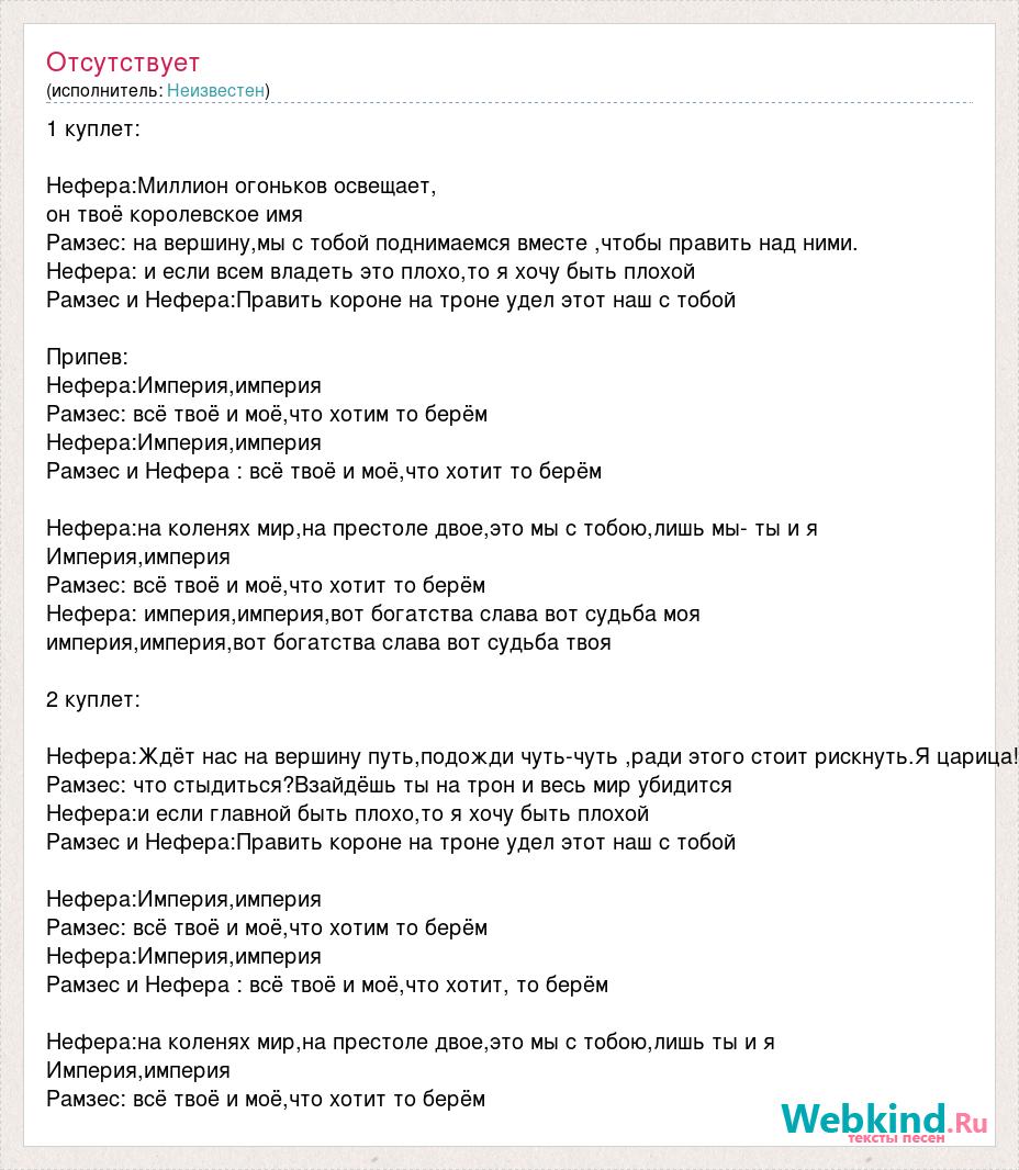 1 куплет: Нефера:Миллион огоньков освещает, он твоё королевское имя Рамзес: на вершину,мы с тобой поднимаемся вместе ,чтобы править над ними. Нефера: и если всем владеть это плохо,то я хочу быть плохой Рамзес и Нефера:Править короне на троне удел этот наш с тобой Припев: Нефера:Империя,империя Рамзес: всё твоё и моё,что хотим то берём Нефера:Империя,империя Рамзес и Нефера : всё твоё и моё,что хотит то берём Нефера:на коленях мир,на престоле двое,это мы с тобою,лишь мы- ты и я Империя,империя Рамзес: всё твоё и моё,что хотит то берём Нефера: империя,империя,вот богатства слава вот судьба моя империя,империя,вот богатства слава вот судьба твоя 2 куплет: Нефера:Ждёт нас на вершину путь,подожди чуть-чуть ,ради этого стоит рискнуть.Я царица! Рамзес: что стыдиться?Взайдёшь ты на трон и весь мир убидится Нефера:и если главной быть плохо,то я хочу быть плохой Рамзес и Нефера:Править короне на троне удел этот наш с тобой Нефера:Империя,империя Рамзес: всё твоё и моё,что хотим то берём Нефера:Империя,империя Рамзес и Нефера : всё твоё и моё,что хотит, то берём Нефера:на коленях мир,на престоле двое,это мы с тобою,лишь ты и я Империя,империя Рамзес: всё твоё и моё,что хотит то берём