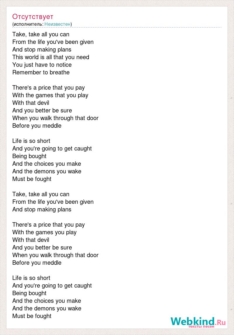Take, take all you can From the life you've been given And stop making plans This world is all that you need You just have to notice Remember to breathe There's a price that you pay With the games that you play With that devil And you better be sure When you walk through that door Before you meddle Life is so short And you're going to get caught Being bought And the choices you make And the demons you wake Must be fought Take, take all you can From the life you've been given And stop making plans There's a price that you pay With the games you play With that devil And you better be sure When you walk through that door Before you meddle Life is so short And you're going to get caught Being bought And the choices you make And the demons you wake Must be fought
