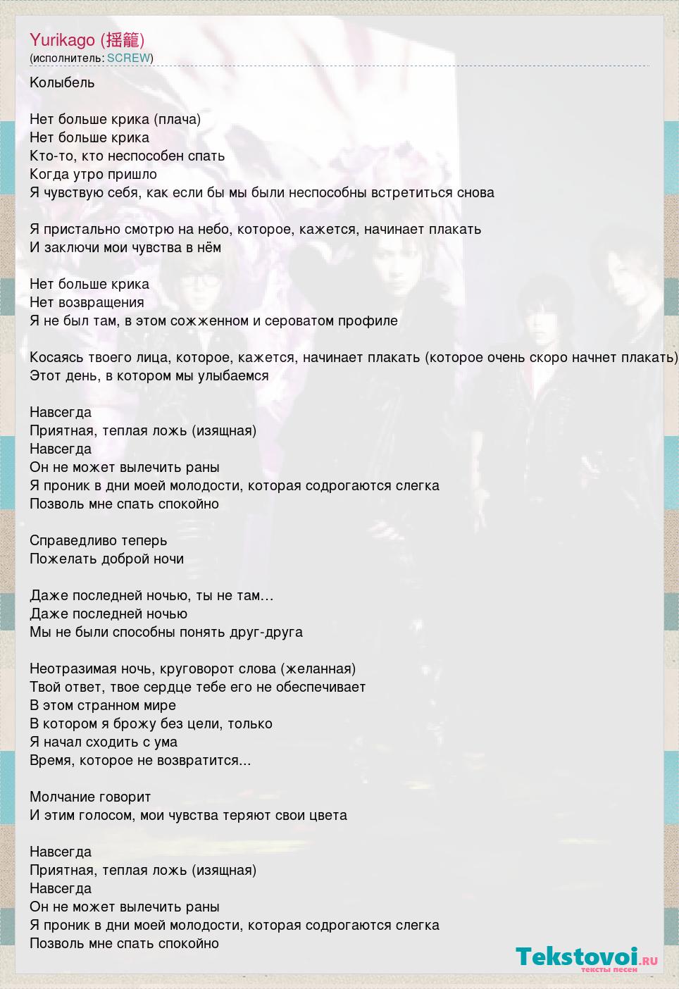 Kолыбель Нет больше крика (плача) Нет больше крика Кто-то, кто неспособен спать Когда утро пришло Я чувствую себя, как если бы мы были неспособны встретиться снова Я пристально смотрю на небо, которое, кажется, начинает плакать И заключи мои чувства в нём Нет больше крика Нет возвращения Я не был там, в этом сожженном и сероватом профиле Косаясь твоего лица, которое, кажется, начинает плакать (которое очень скоро начнет плакать) Этот день, в котором мы улыбаемся Навсегда Приятная, теплая ложь (изящная) Навсегда Он не может вылечить раны Я проник в дни моей молодости, которая содрогаются слегка Позволь мне спать спокойно Справедливо теперь Пожелать доброй ночи Даже последней ночью, ты не там… Даже последней ночью Мы не были способны понять друг-друга Неотразимая ночь, круговорот слова (желанная) Твой ответ, твое сердце тебе его не обеспечивает В этом странном мире В котором я брожу без цели, только Я начал сходить с ума Время, которое не возвратится... Молчание говорит И этим голосом, мои чувства теряют свои цвета Навсегда Приятная, теплая ложь (изящная) Навсегда Он не может вылечить раны Я проник в дни моей молодости, которая содрогаются слегка Позволь мне спать спокойно