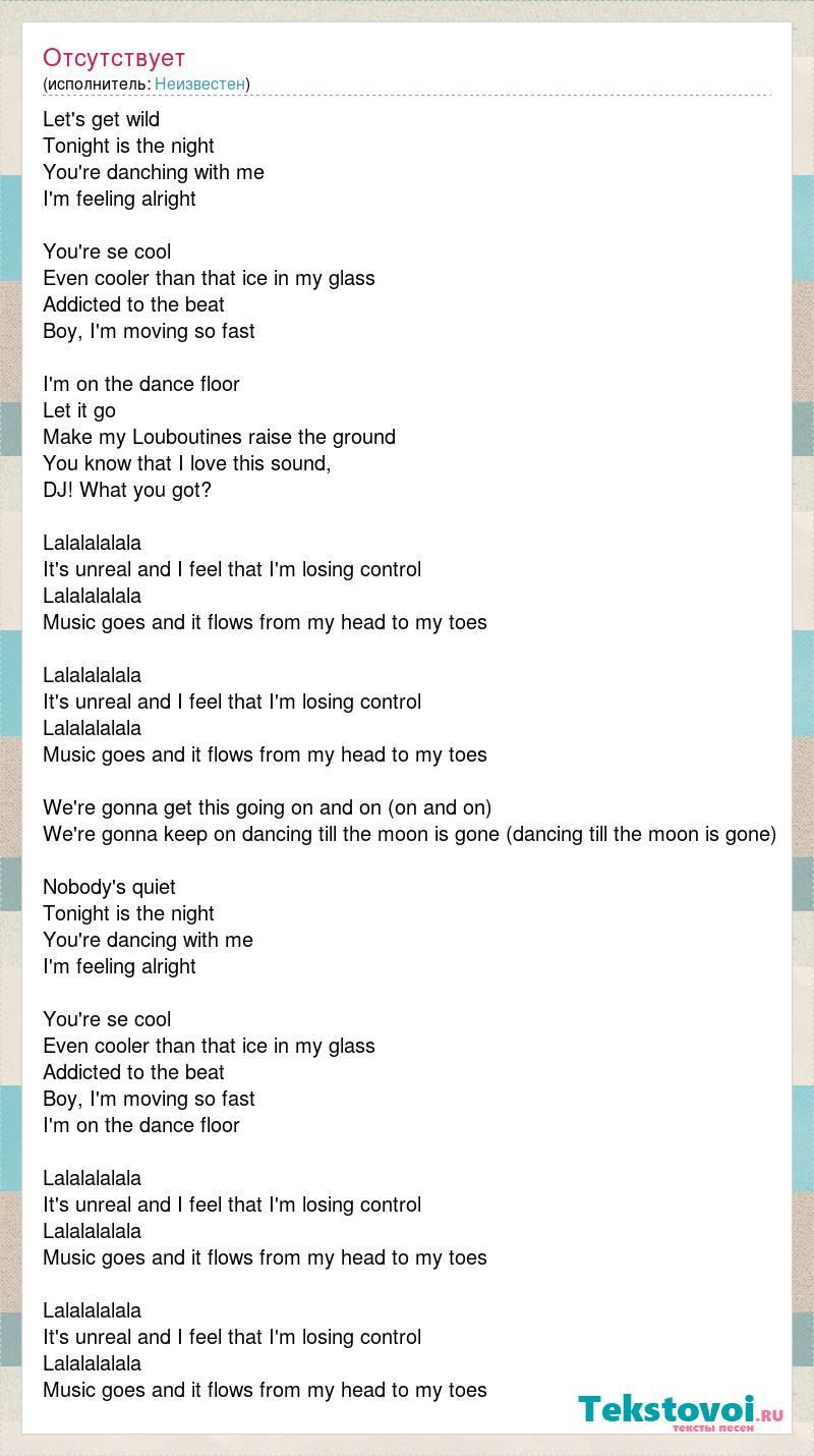 Let's get wild Tonight is the night You're danching with me I'm feeling alright You're se cool Even cooler than that ice in my glass Addicted to the beat Boy, I'm moving so fast I'm on the dance floor Let it go Make my Louboutines raise the ground You know that I love this sound, DJ! What you got? Lalalalalala It's unreal and I feel that I'm losing control Lalalalalala Music goes and it flows from my head to my toes Lalalalalala It's unreal and I feel that I'm losing control Lalalalalala Music goes and it flows from my head to my toes We're gonna get this going on and on (on and on) We're gonna keep on dancing till the moon is gone (dancing till the moon is gone) Nobody's quiet Tonight is the night You're dancing with me I'm feeling alright You're se cool Even cooler than that ice in my glass Addicted to the beat Boy, I'm moving so fast I'm on the dance floor Lalalalalala It's unreal and I feel that I'm losing control Lalalalalala Music goes and it flows from my head to my toes Lalalalalala It's unreal and I feel that I'm losing control Lalalalalala Music goes and it flows from my head to my toes