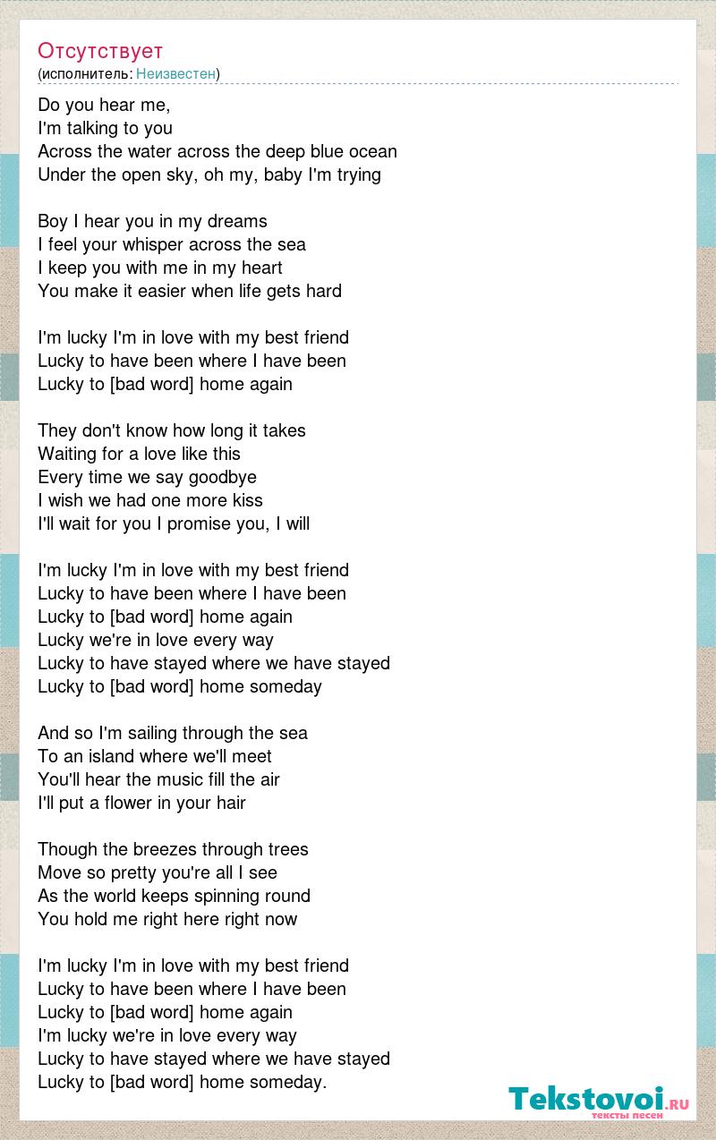 Do you hear me, I'm talking to you Across the water across the deep blue ocean Under the open sky, oh my, baby I'm trying Boy I hear you in my dreams I feel your whisper across the sea I keep you with me in my heart You make it easier when life gets hard I'm lucky I'm in love with my best friend Lucky to have been where I have been Lucky to [bad word] home again They don't know how long it takes Waiting for a love like this Every time we say goodbye I wish we had one more kiss I'll wait for you I promise you, I will I'm lucky I'm in love with my best friend Lucky to have been where I have been Lucky to [bad word] home again Lucky we're in love every way Lucky to have stayed where we have stayed Lucky to [bad word] home someday And so I'm sailing through the sea To an island where we'll meet You'll hear the music fill the air I'll put a flower in your hair Though the breezes through trees Move so pretty you're all I see As the world keeps spinning round You hold me right here right now I'm lucky I'm in love with my best friend Lucky to have been where I have been Lucky to [bad word] home again I'm lucky we're in love every way Lucky to have stayed where we have stayed Lucky to [bad word] home someday.