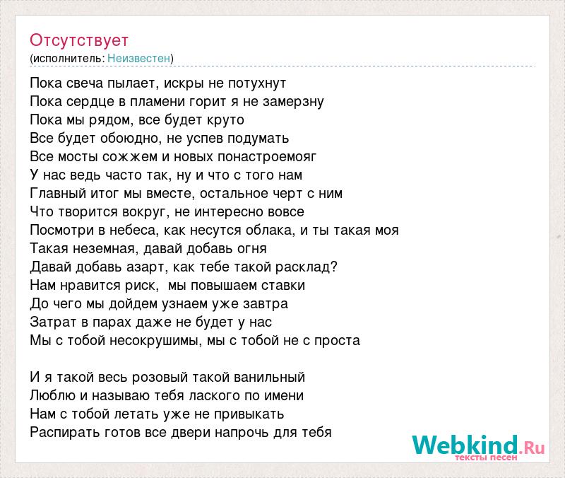 Пока свеча пылает, искры не потухнут Пока сердце в пламени горит я не замерзну Пока мы рядом, все будет круто Все будет обоюдно, не успев подумать Все мосты сожжем и новых понастроемояг У нас ведь часто так, ну и что с того нам Главный итог мы вместе, остальное черт с ним Что творится вокруг, не интересно вовсе Посмотри в небеса, как несутся облака, и ты такая моя Такая неземная, давай добавь огня Давай добавь азарт, как тебе такой расклад? Нам нравится риск, мы повышаем ставки До чего мы дойдем узнаем уже завтра Затрат в парах даже не будет у нас Мы с тобой несокрушимы, мы с тобой не с проста И я такой весь розовый такой ванильный Люблю и называю тебя лаского по имени Нам с тобой летать уже не привыкать Распирать готов все двери напрочь для тебя