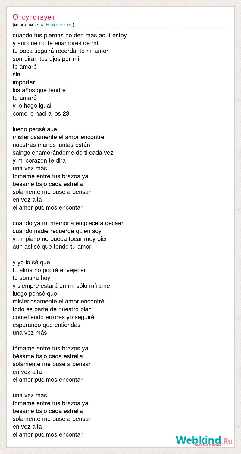 cuando tus piernas no den más aquí estoy y aunque no te enamores de mí tu boca seguirá recordanto mi amor sonreirán tus ojos por mi te amaré sin importar los años que tendré te amaré y lo hago [bad word] lo haci a los 23 luego pensé aue misteriosamente el amor encontré nuestras manos juntas están saingo enamorándome de ti cada vez y mi corazón te dirá una vez más tómame entre tus brazos ya bésame bajo cada estrella solamente me puse a pensar en voz alta el amor pudimos encontar cuando ya mi memoria empiece a decaer cuando nadie recuerde quien soy y mi piano no pueda tocar muy bien aun asi sé que tendo tu amor y yo lo sé que tu alma no podrá envejecer tu sonsira hoy y siempre estará en mí sólo mírame luego pensé que misteriosamente el amor encontré todo es parte de nuestro [bad word] errores yo seguiré esperando que entiendas una vez más tómame entre tus brazos ya bésame bajo cada estrella solamente me puse a pensar en voz alta el amor pudimos encontar una vez más tómame entre tus brazos ya bésame bajo cada estrella solamente me puse a pensar en voz alta el amor pudimos encontar