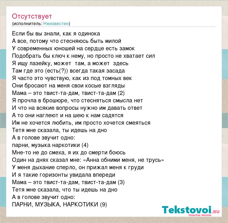 Если бы вы знали, как я одинока А все, потому что стесняюсь быть милой У современных юношей на сердце есть замок Подобрать бы ключ к нему, но просто не хватает сил Я ищу лазейку, может там, а может здесь Там где это (есть(?)) всегда такая засада Я часто это чувствую, как из под томных век Они бросают на меня свои косые взгляды Мама – это твист-та-дам, твист-та-дам (2) Я прочла в брошюре, что стесняться смысла нет И что на всякие вопросы нужно им давать ответ А то они наглеют и на шею к нам садятся Им не хочется любить, им просто хочется смеяться Тетя мне сказала, ты идешь на дно А в голове звучит одно: парни, музыка наркотики (4) Мне-то не до смеха, я их до смерти боюсь Один на днях сказал мне: «Анна обними меня, не трусь» У меня дыхание сперло, он прижал меня к груди И я такие горизонты увидала впереди Мама – это твист-та-дам, твист-та-дам (3) Тетя мне сказала, что ты идешь на дно А в голове звучит одно: ПАРНИ, МУЗЫКА, НАРКОТИКИ (9)