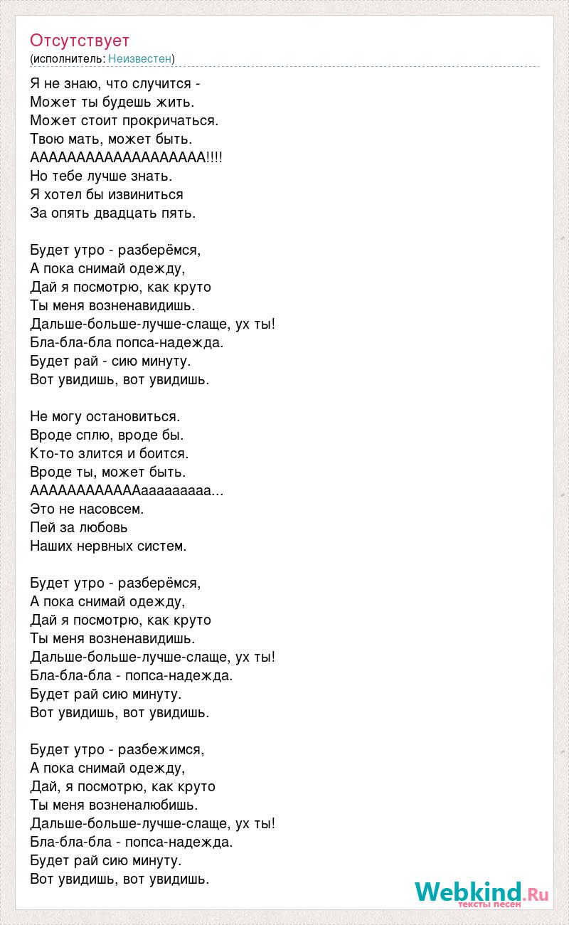 Я не знаю, что случится - Может ты будешь жить. Может стоит прокричаться. Твою мать, может быть. ААААААААААААААААААА!!!! Но тебе лучше знать. Я хотел бы извиниться За опять двадцать пять. Будет утро - разберёмся, А пока снимай одежду, Дай я посмотрю, как круто Ты меня возненавидишь. Дальше-больше-лучше-слаще, ух ты! Бла-бла-бла попса-надежда. Будет рай - сию минуту. Вот увидишь, вот увидишь. Не могу остановиться. Вроде сплю, вроде бы. Кто-то злится и боится. Вроде ты, может быть. ААААААААААААааааааааа... Это не насовсем. Пей за любовь Наших нервных систем. Будет утро - разберёмся, А пока снимай одежду, Дай я посмотрю, как круто Ты меня возненавидишь. Дальше-больше-лучше-слаще, ух ты! Бла-бла-бла - попса-надежда. Будет рай сию минуту. Вот увидишь, вот увидишь. Будет утро - разбежимся, А пока снимай одежду, Дай, я посмотрю, как круто Ты меня возненалюбишь. Дальше-больше-лучше-слаще, ух ты! Бла-бла-бла - попса-надежда. Будет рай сию минуту. Вот увидишь, вот увидишь.