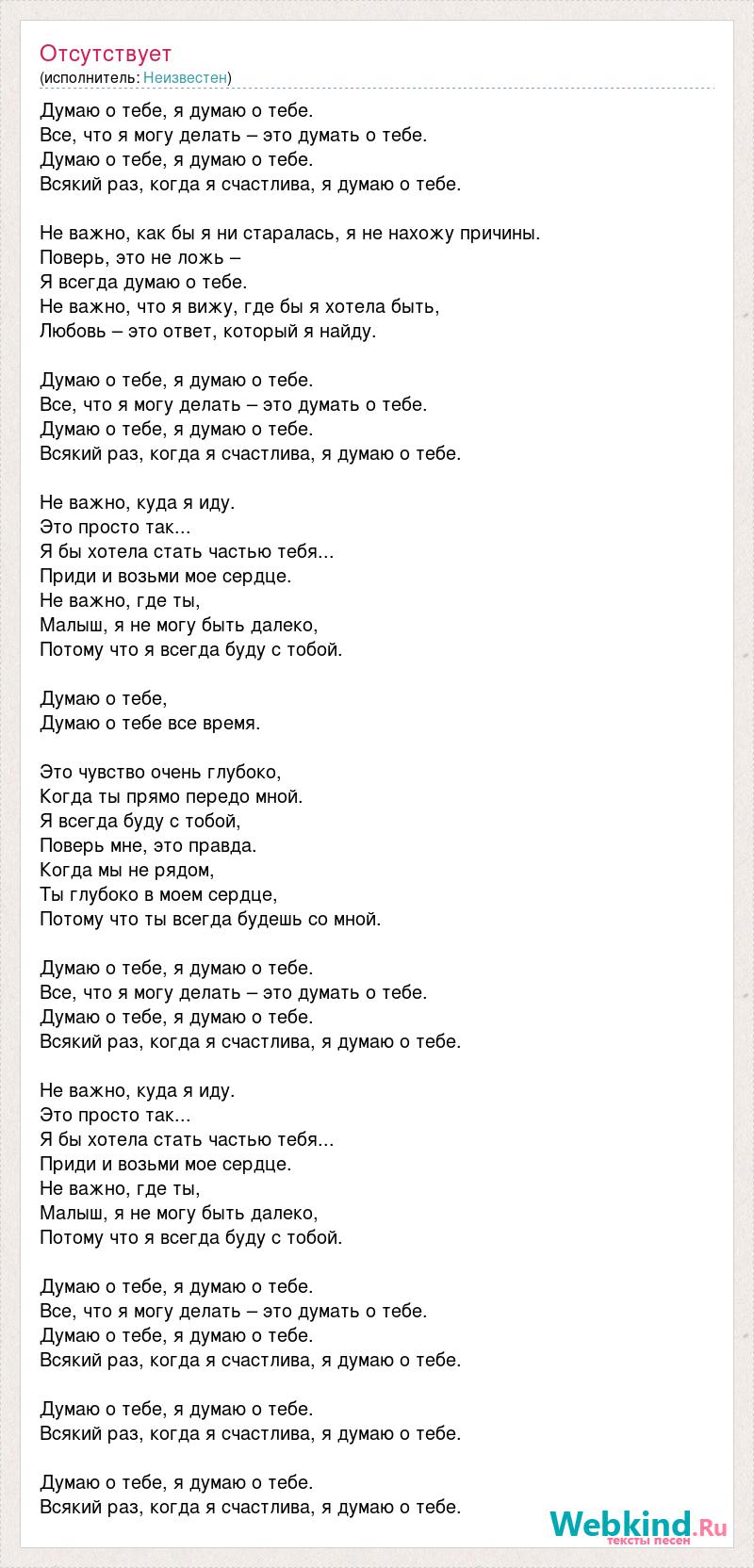 Думаю о тебе, я думаю о тебе. Все, что я могу делать – это думать о тебе. Думаю о тебе, я думаю о тебе. Всякий раз, когда я счастлива, я думаю о тебе. Не важно, как бы я ни старалась, я не нахожу причины. Поверь, это не ложь – Я всегда думаю о тебе. Не важно, что я вижу, где бы я хотела быть, Любовь – это ответ, который я найду. Думаю о тебе, я думаю о тебе. Все, что я могу делать – это думать о тебе. Думаю о тебе, я думаю о тебе. Всякий раз, когда я счастлива, я думаю о тебе. Не важно, куда я иду. Это просто так... Я бы хотела стать частью тебя... Приди и возьми мое сердце. Не важно, где ты, Малыш, я не могу быть далеко, Потому что я всегда буду с тобой. Думаю о тебе, Думаю о тебе все время. Это чувство очень глубоко, Когда ты прямо передо мной. Я всегда буду с тобой, Поверь мне, это правда. Когда мы не рядом, Ты глубоко в моем сердце, Потому что ты всегда будешь со мной. Думаю о тебе, я думаю о тебе. Все, что я могу делать – это думать о тебе. Думаю о тебе, я думаю о тебе. Всякий раз, когда я счастлива, я думаю о тебе. Не важно, куда я иду. Это просто так... Я бы хотела стать частью тебя... Приди и возьми мое сердце. Не важно, где ты, Малыш, я не могу быть далеко, Потому что я всегда буду с тобой. Думаю о тебе, я думаю о тебе. Все, что я могу делать – это думать о тебе. Думаю о тебе, я думаю о тебе. Всякий раз, когда я счастлива, я думаю о тебе. Думаю о тебе, я думаю о тебе. Всякий раз, когда я счастлива, я думаю о тебе. Думаю о тебе, я думаю о тебе. Всякий раз, когда я счастлива, я думаю о тебе.