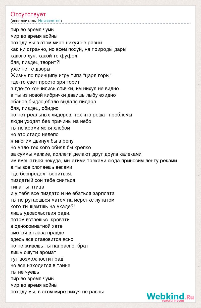 пир во время чумы мир во время войны походу мы в этом мире нихуя не равны как ни странно, но всем похуй, на природы дары какого хуя, какой то фуфел бля, пиздец творит?! уже не те дворы Жизнь по принципу игру типа "царя горы" где-то свет просто зря горит а где-то кончились спички, им нихуя не видно а ты из новой кибрички давишь лыбу ехидно ебаное быдло,ебало выдало пидара бля, пиздец, обидно но нет реальных лидеров, тех что решат проблемы люди уходят без причины на небо ты не корми меня хлебом но это стадо нелепо я многим двинул бы в репу но мало тех кого обнял бы крепко за суммы мелкие, коллеги делают друг друга калеками им вмешаться некуда, мы этими треками сюда приносим ленту реками а ты все хлопаешь веками где беспредел твориться. пиздатый сон тебе сниться типа ты птица и у тебя все пиздато и не ебаться зарплата ты не ругаешься матом на меренке лупатом кого ты щемтшь на мкаде?! лишь удовольствия ради. потом встаешьс кровати в однокомнатной хате смотри в глаза правде здесь все ставовится ясно но не живешь ты напрасно, брат лишь ощути аромат тут возможности град но все находится в тайне ты не чуешь пир во время чумы мир во время войны походу мы, в этом мире нихуя не равны